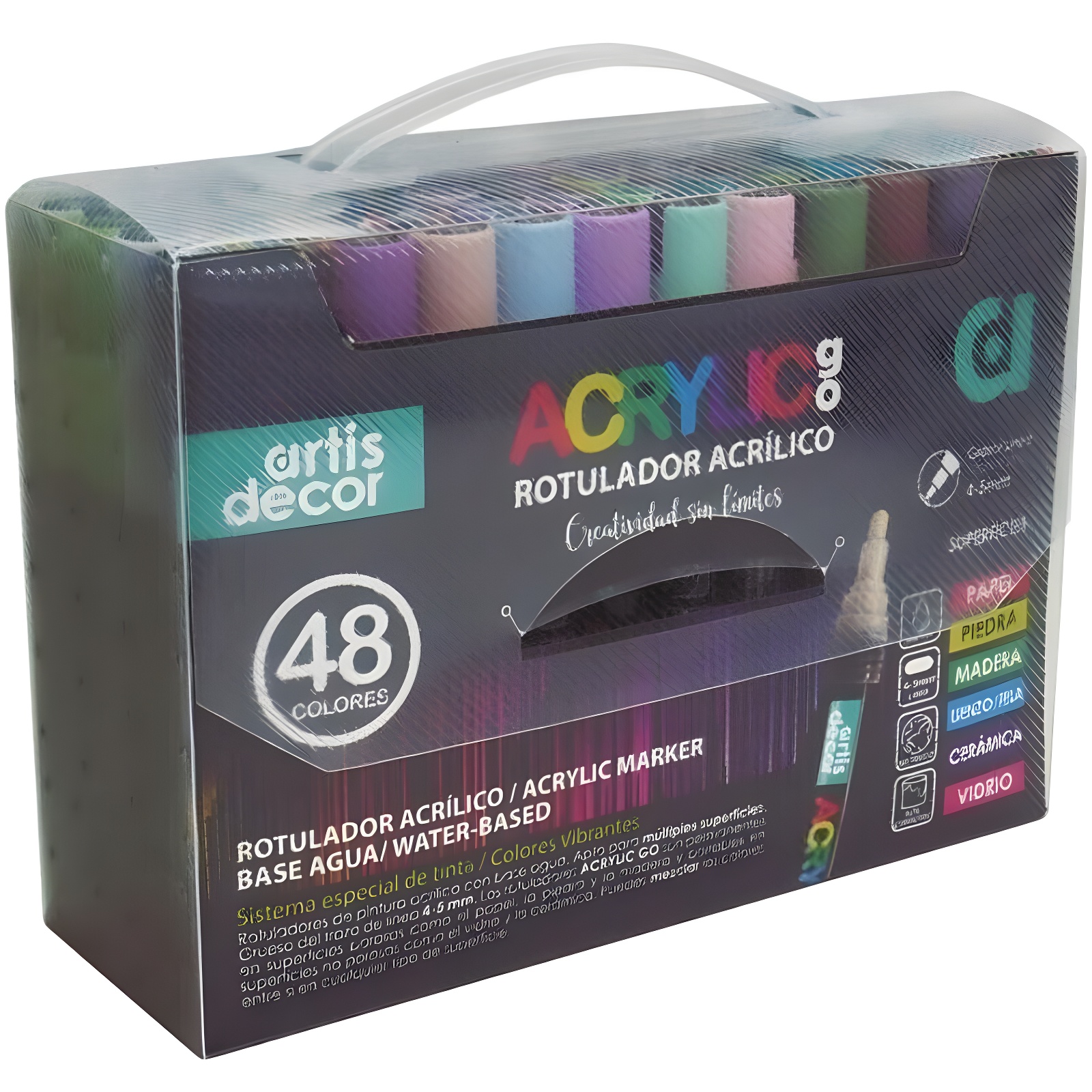 - Confezione da 48 pennarelli acrilici a base d'acqua.