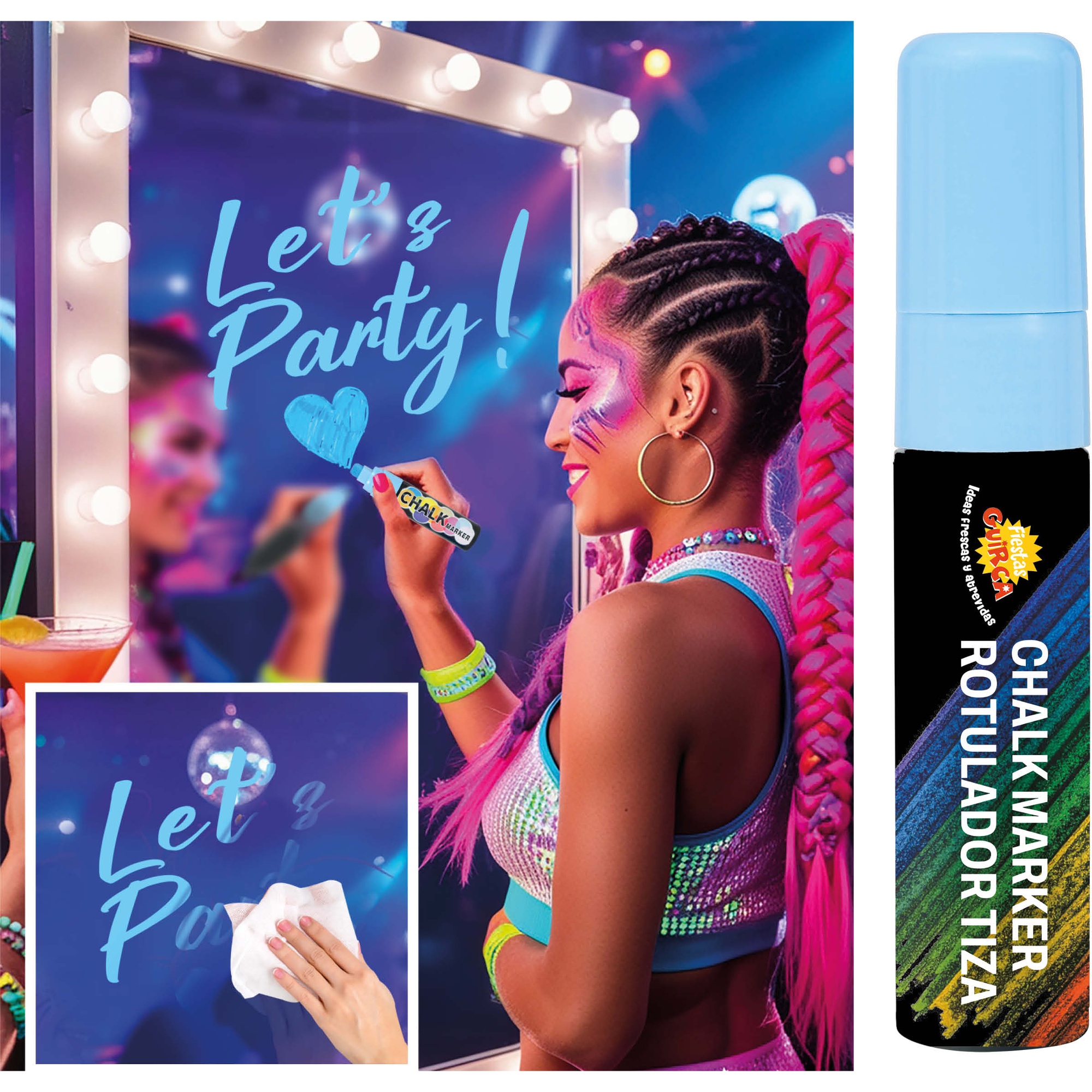 Pennarello a gesso liquido blu pensato per decorare specchi e superfici in vetro con segni nitidi e colore vivace. Il formato a pennarello facilita la realizzazione di scritte, forme e dettagli con grande precisione. Funziona su superfici non porose come specchi, vetrine e lavagne, offrendo una finitura lucida che valorizza ogni ambiente festivo. Ideale per messaggi temporanei, segnaletica e decorazioni d'impatto per i tuoi eventi.