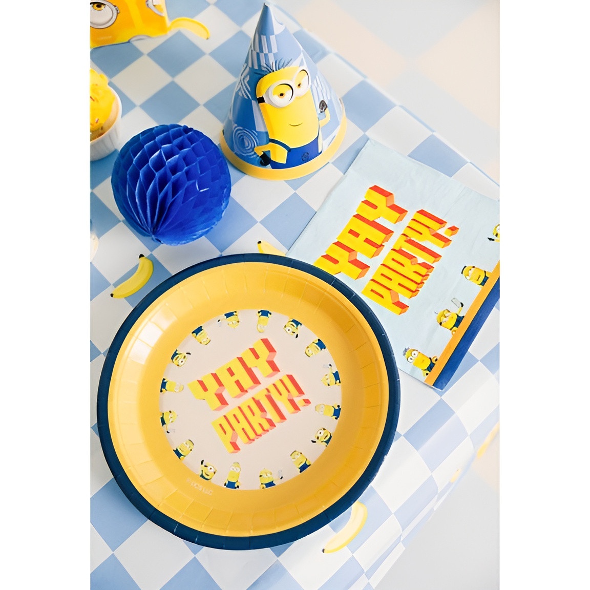 Piatti usa e getta con il divertente design dei Minions e la scritta Yay Party!.