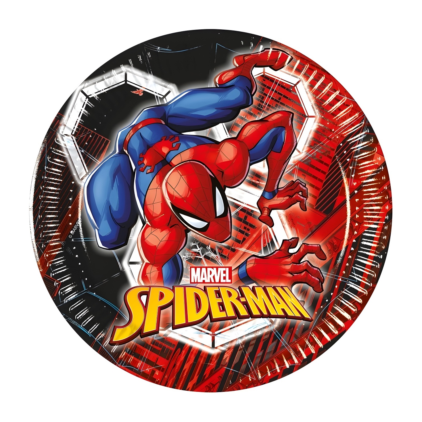 Piatti monouso dal design vivace di Spider-Man con motivi a ragnatela, perfetti per animare ogni festa per bambini. Confezione da 8 pezzi, diametro 20 cm, ideale per porzioni dei più piccoli. Realizzati in cartone certificato FSC, perfetti per servire snack e piatti durante la festa.