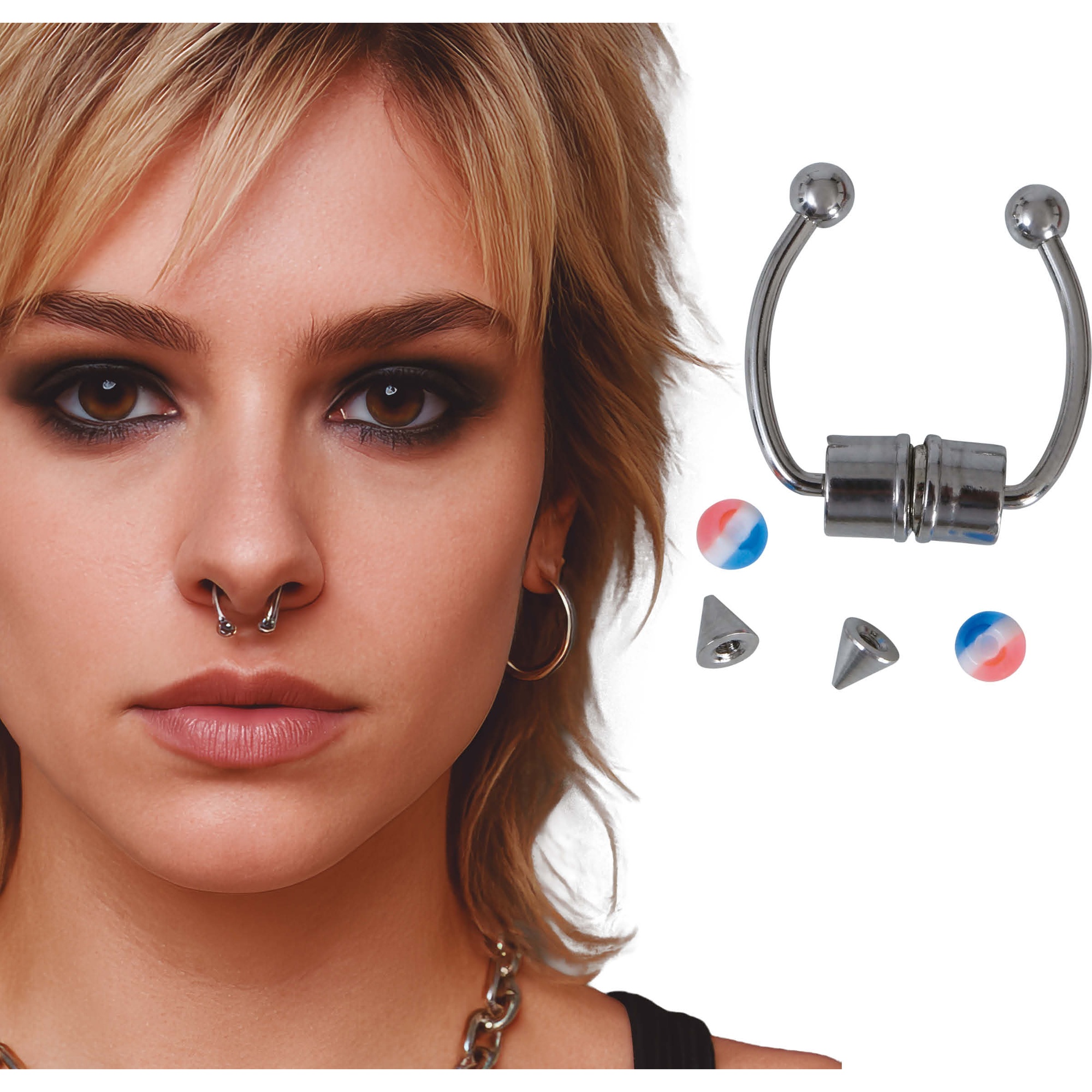 Ottieni l'effetto di un piercing senza ricorrere alla perforazione con questa confezione assortita di piercing finti per il naso. Design realistico e discreto pensato per cambiare look in pochi secondi. Chiusura pratica e punte intercambiabili che facilitano l'applicazione e la combinazione in base al tuo stile. Perfetti per Carnevale, feste a tema, sessioni fotografiche o semplicemente per provare temporaneamente un nuovo look.