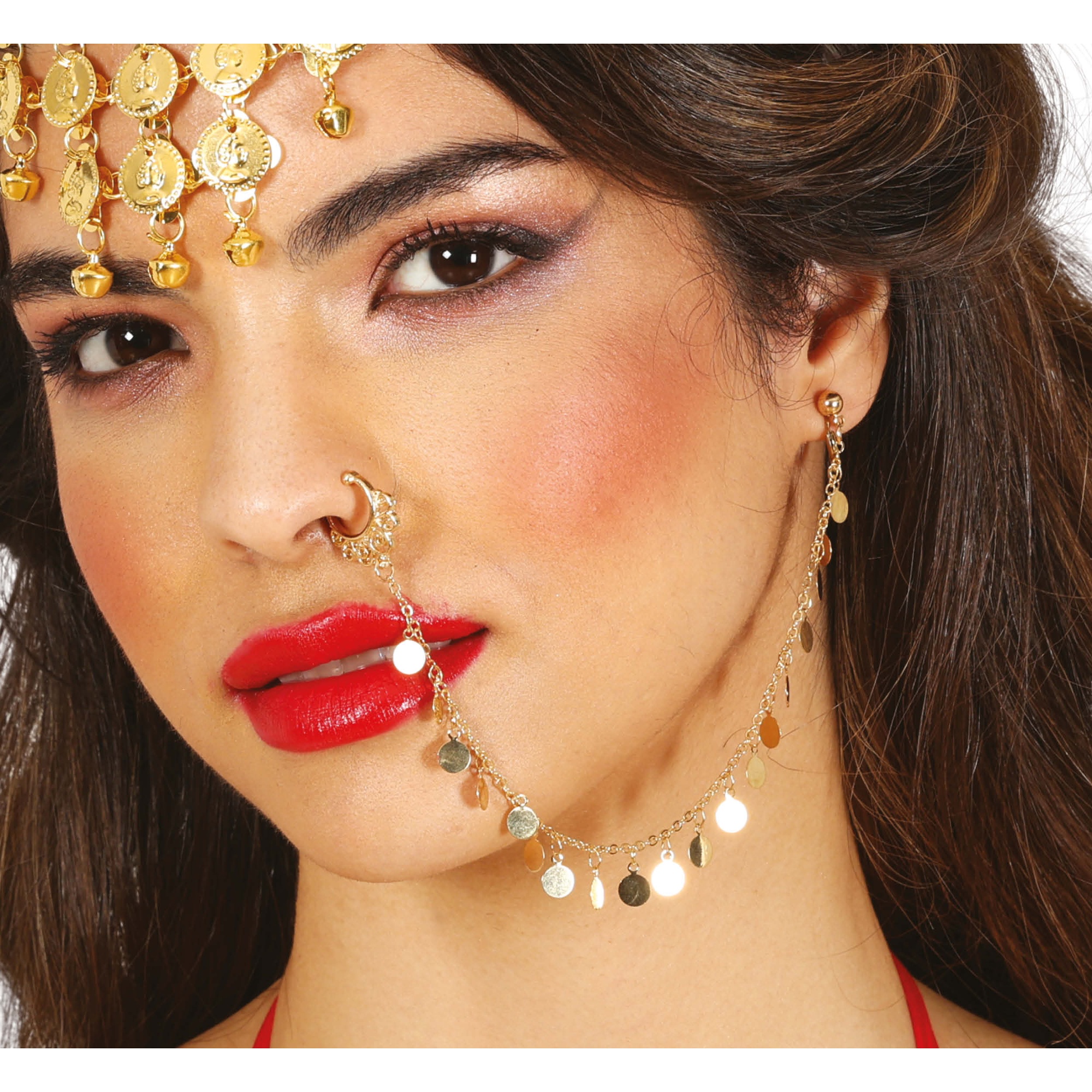 Elegante piercing finto che collega il naso all'orecchio con una catena decorativa di monetine, perfetto per look da principessa araba o per cosplay ispirati a Jasmine.