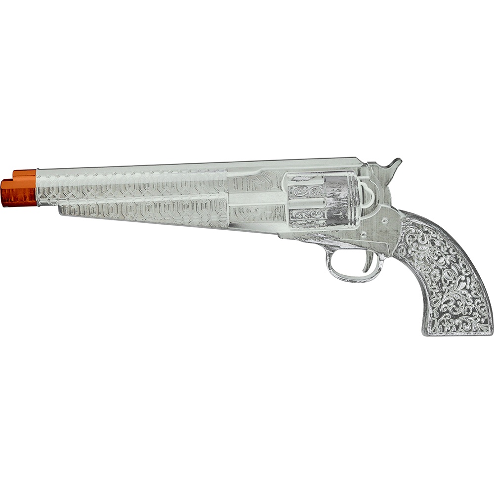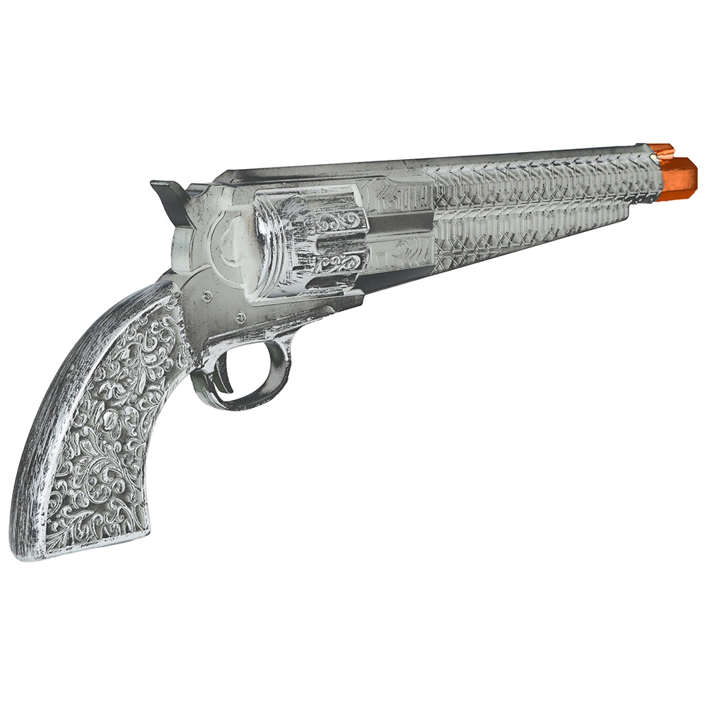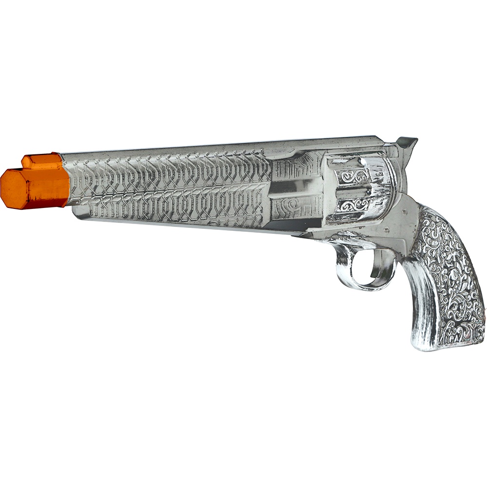Pistola giocattolo con finitura argentata e design classico in stile western, pensata per completare travestimenti e giochi di ruolo. Misura circa 30 cm ed è realizzata in PVC leggero, che dona un aspetto vistoso senza appesantire. Presenta una punta di sicurezza arancione ben visibile per un uso più sicuro durante feste ed eventi.