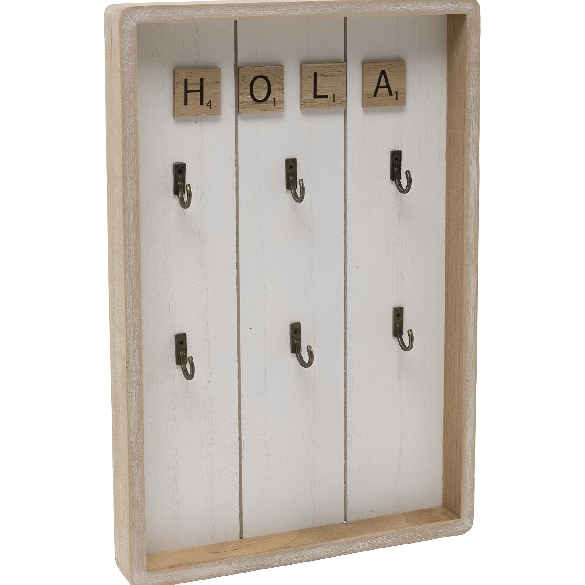 Organizza le tue chiavi con stile grazie a questo portachiavi quadrato 'Hola' di Dcasa. La sua estetica rustica e le lettere in stile Scrabble conferiscono calore e personalità a ogni ingresso. È dotato di diversi ganci metallici resistenti per tenere in ordine portachiavi e piccoli accessori; la cornice in legno con finitura invecchiata si integra perfettamente con ambienti in stile vintage, nordico o shabby chic. Un elemento pratico e decorativo che migliora l'ordine e l'aspetto della tua casa.