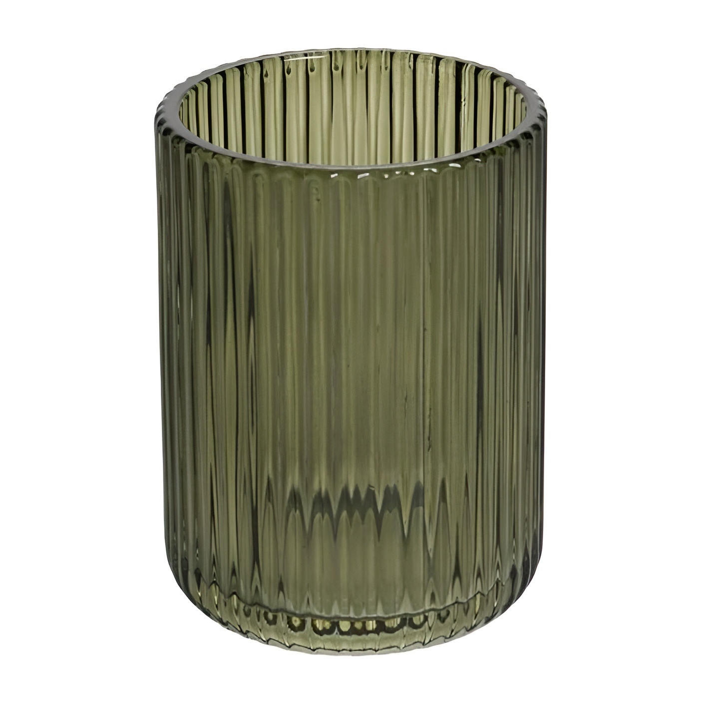 Bicchiere portaspazzolini di colore verde con un elegante design rigato che conferisce stile e personalità al bagno. Compatto e funzionale, mantiene spazzolini e piccoli accessori in ordine senza occupare troppo spazio. Le sue linee verticali aggiungono un dettaglio decorativo perfetto per ambienti moderni e classici.