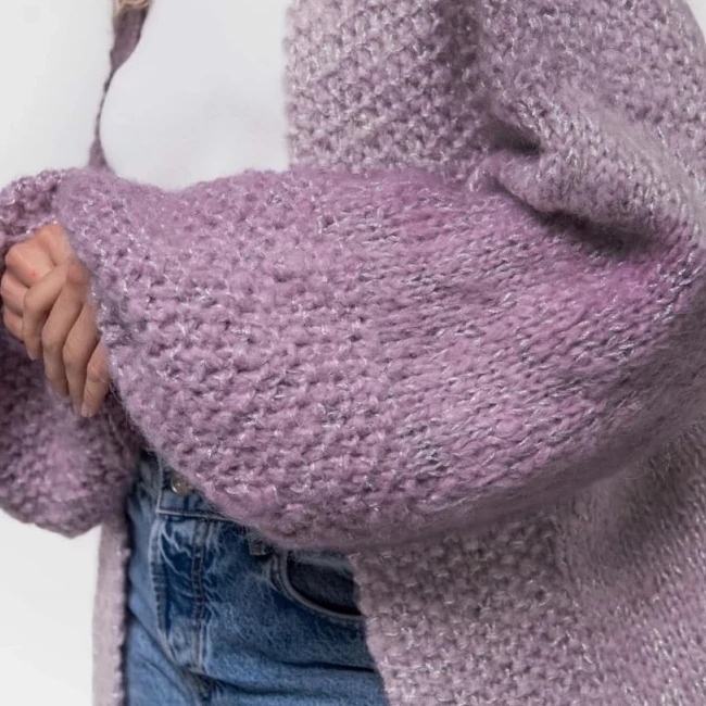 - Troverai le spiegazioni per lavorare a maglia un cardigan con bordi larghi e un top in punto riso, decorato con maniche a sbuffo e punto riso sui polsini.