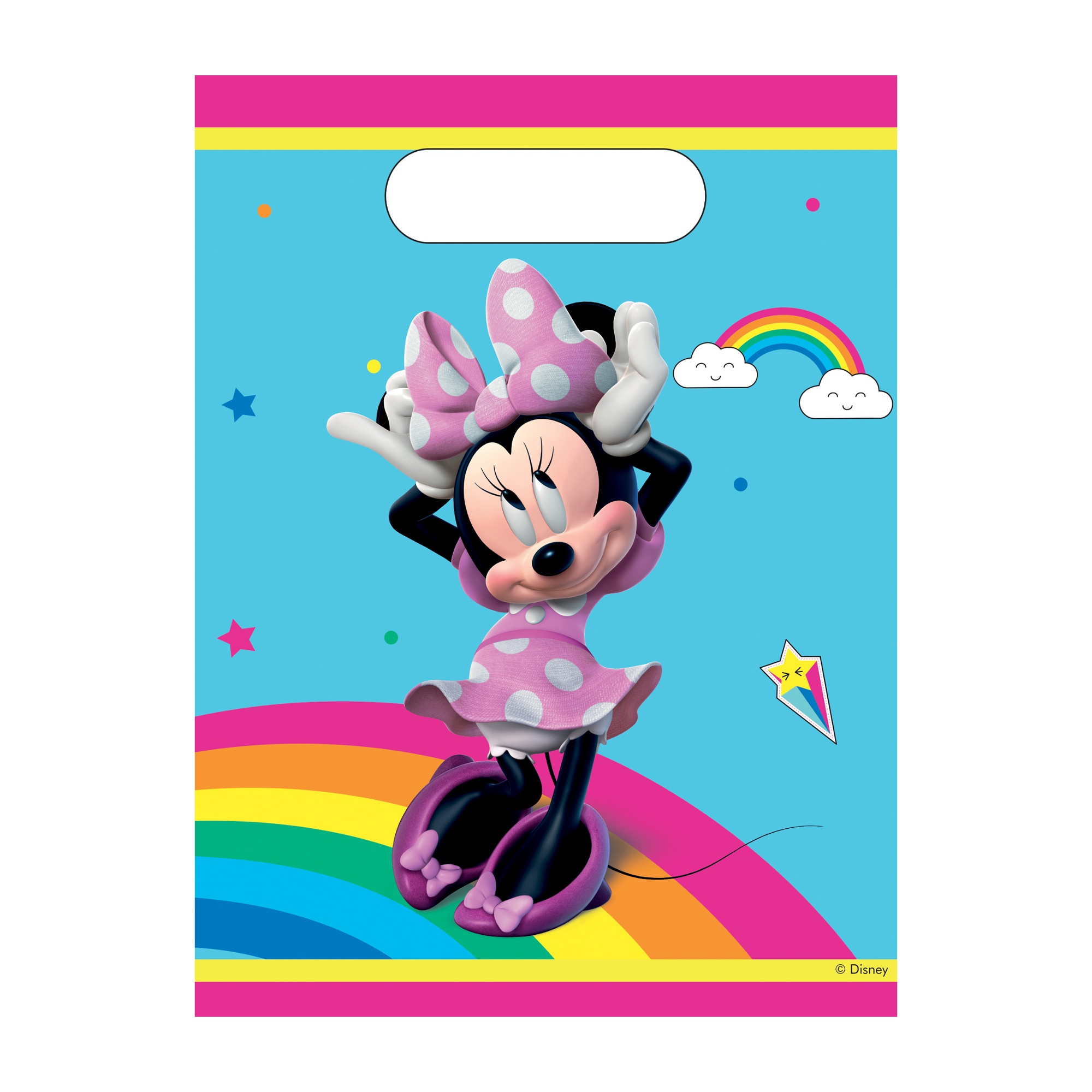 Confezione da 6 sacchetti con design di Minnie Mouse e arcobaleno, ideali per aggiungere colore e allegria a ogni festa.