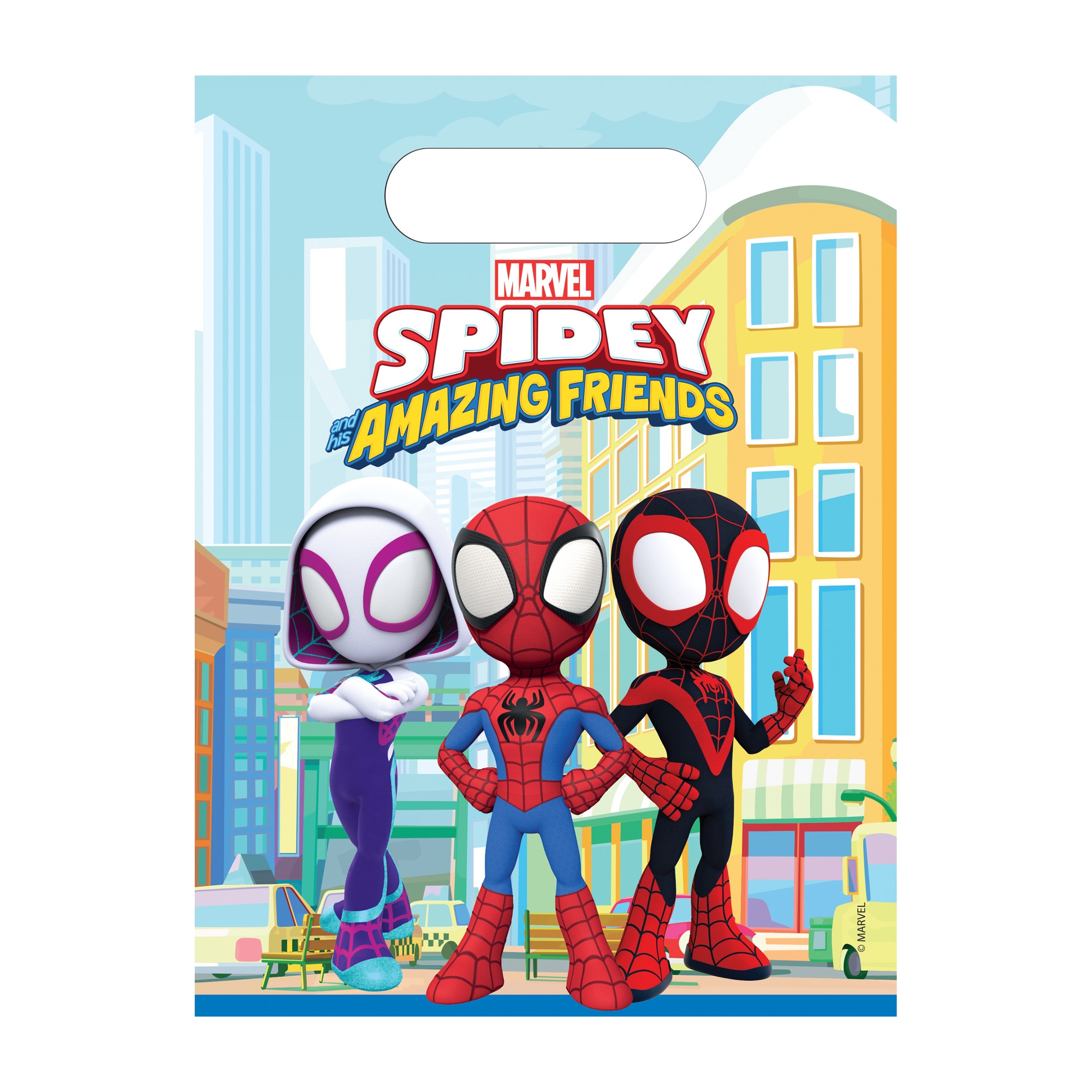Confezione di sacchetti con il divertente design di Spidey e dei suoi amici, perfetta per sorprendere i più piccoli. Grafiche vivaci e personaggi riconoscibili che animano qualsiasi festa per bambini. Maniglia ritagliata per un trasporto comodo e una distribuzione semplice. Prodotto pensato per rendere più facile l'organizzazione di feste e regalini.