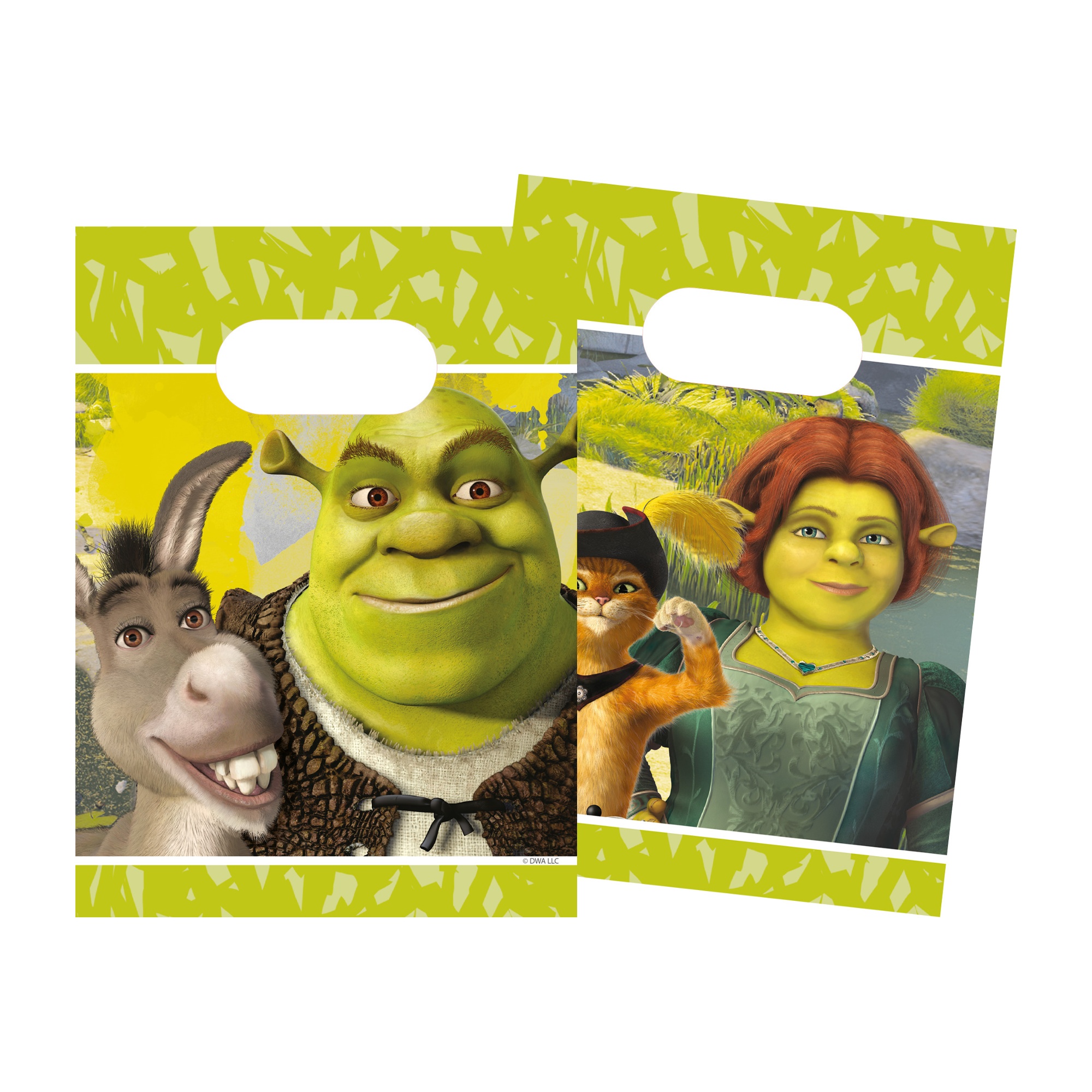 Confezione di sacchetti con i personaggi di Shrek, pensata per aggiungere colore e divertimento alle feste per bambini.