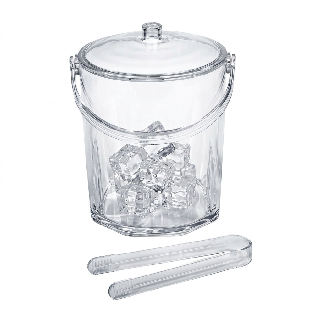 Secchiello trasparente in acrilico con pinze, progettato per servire il ghiaccio con stile e praticità.