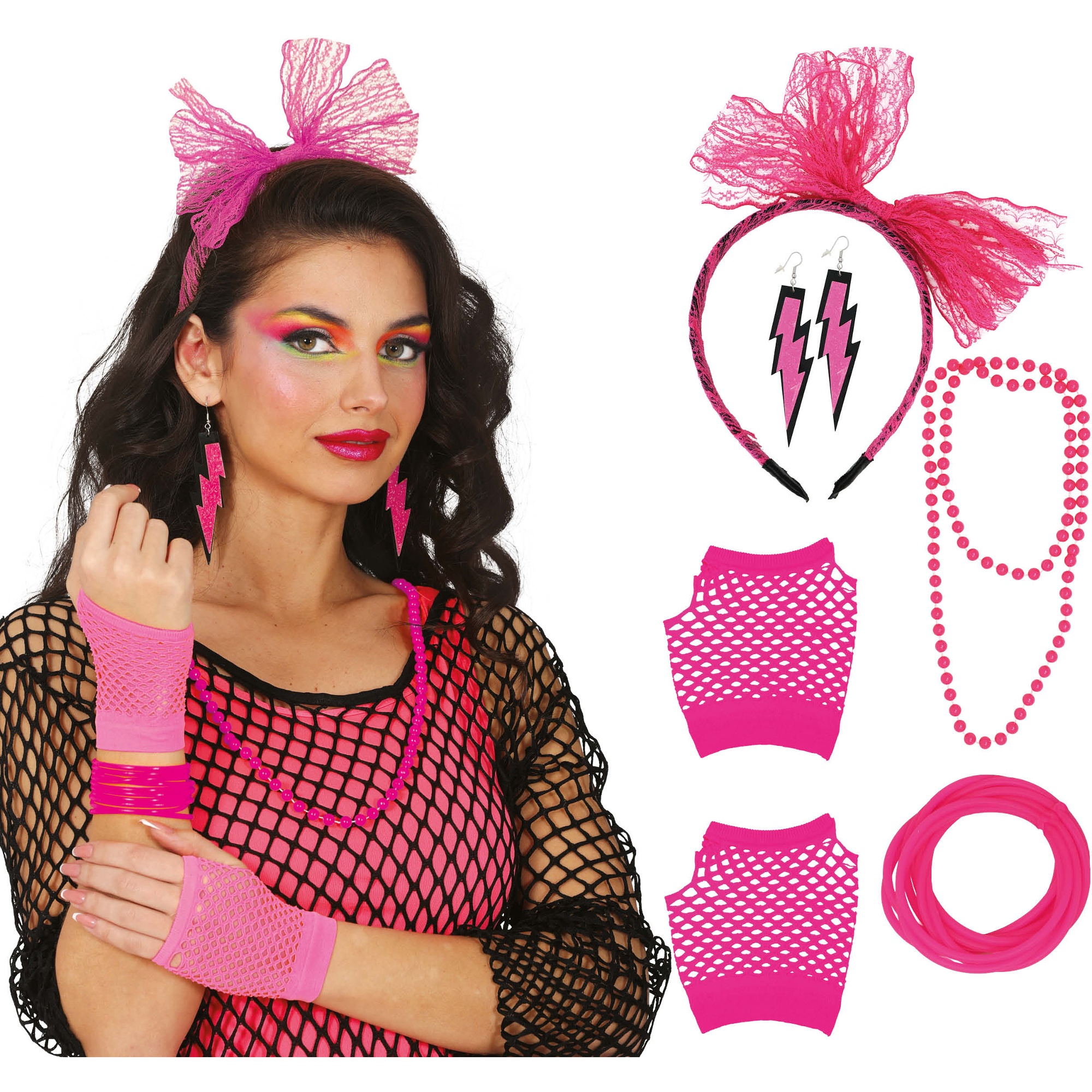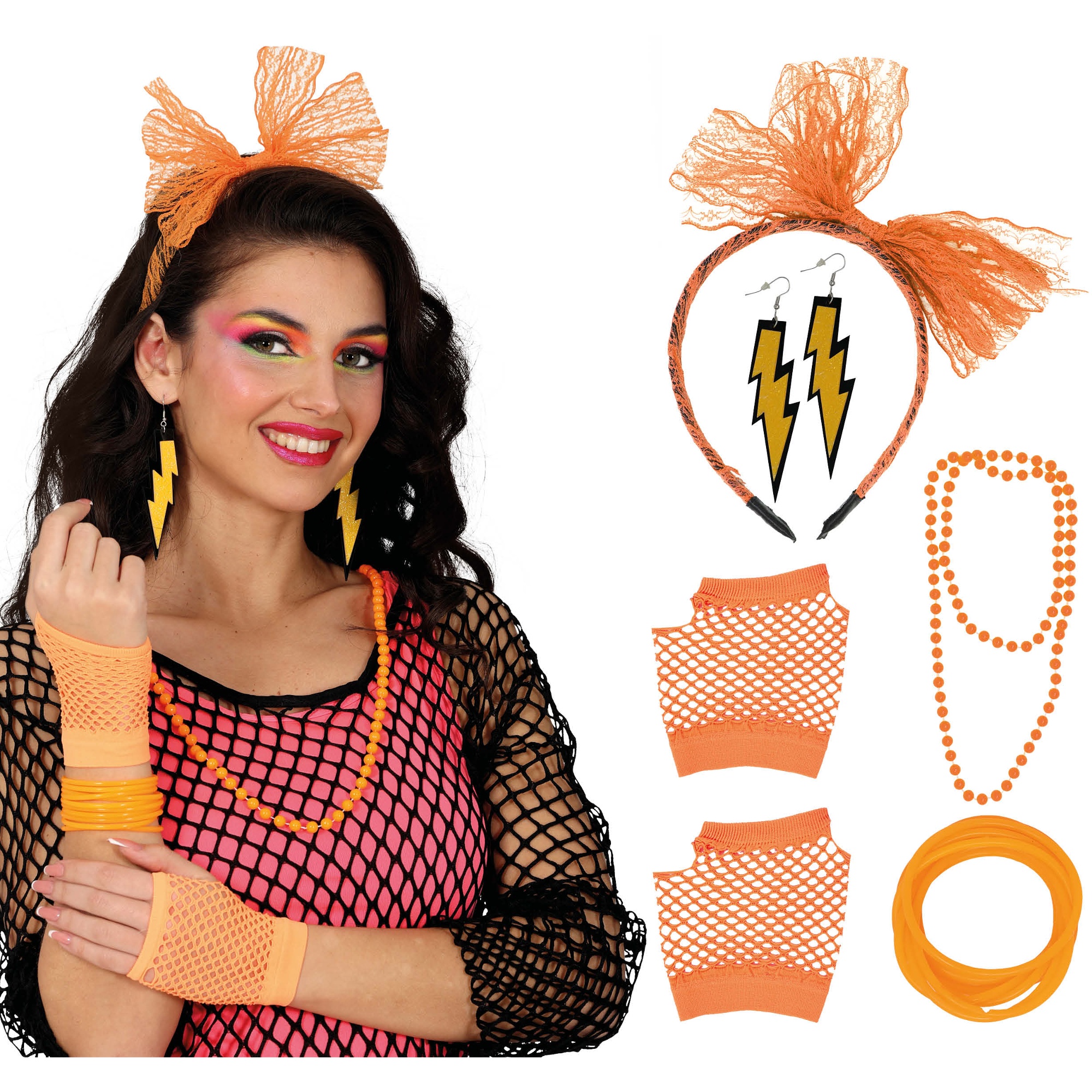 Conquista la pista da ballo con un look retrò e pieno di colore grazie a questo set di accessori ispirato agli anni '80. I toni neon e le forme audaci donano uno stile deciso e immediatamente riconoscibile. Gli elementi sono leggeri e confortevoli, pensati per essere indossati per tutta la serata senza rinunciare all'impatto visivo. Ideale da abbinare a un trucco in stile anni '80 e a capi in rete o colori intensi per un risultato autentico.