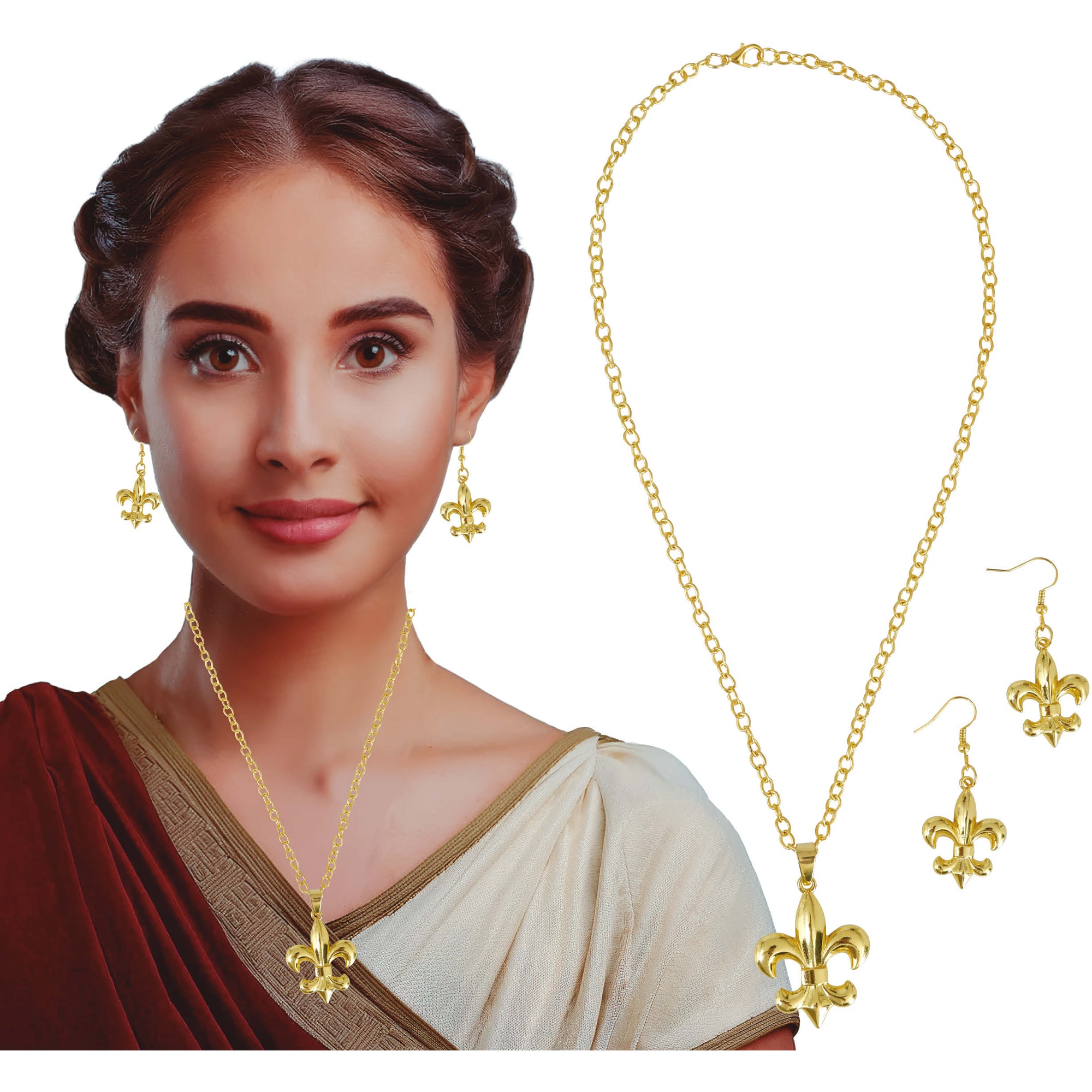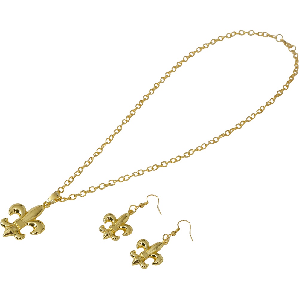 Elegante set ispirato alla gioielleria dell'antica Roma, con un distintivo motivo a giglio stilizzato. La finitura dorata dona una lucentezza curata che valorizza qualsiasi look storico o fantasy. Pezzi leggeri e confortevoli, pensati per aggiungere un tocco imperiale a celebrazioni ed eventi.