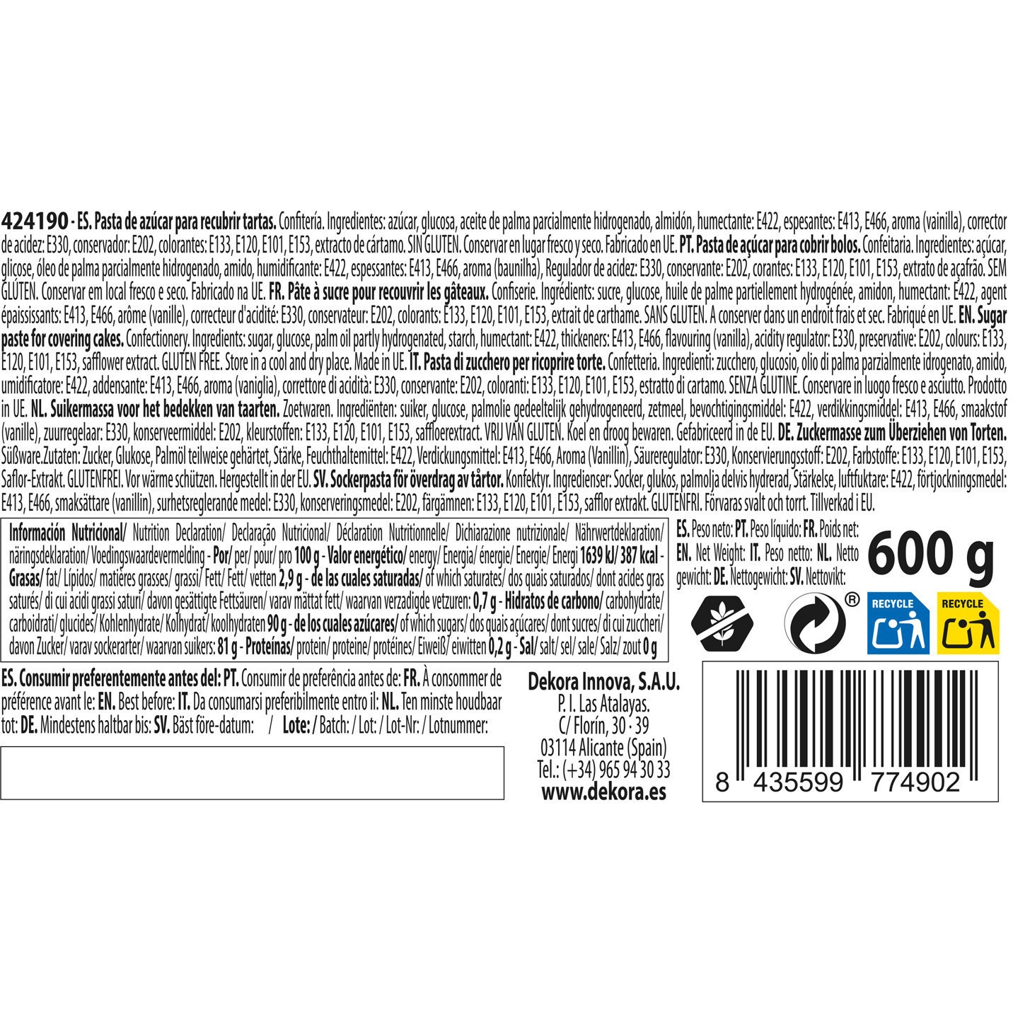 Ingredienti: Olio vegetale parzialmente idrogenato, Amido, Aroma (vaniglia), Zucchero, Estratto di cartamo, Glucosio, Coloranti: E101, E120, E133, E153, Addensanti: E413, E466, Umidificanti: E422, Acidificante: E330, Conservanti: E202.