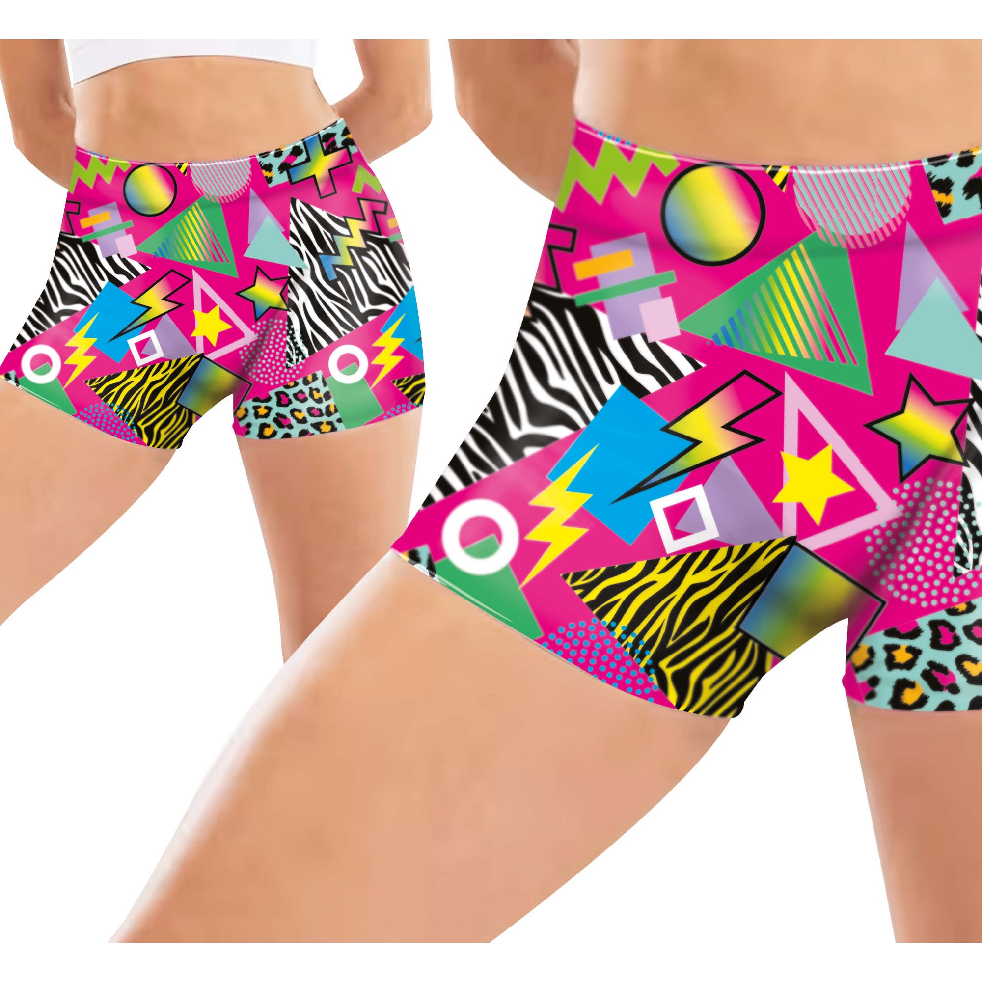 Short elasticizzati con una vivace stampa retrò in tonalità neon ispirata all'estetica anni '80. Il taglio aderente e la vita ampia assicurano una vestibilità comoda e valorizzante, ideale per allenamenti, danza, festival o serate a tema. Il tessuto in poliestere elasticizzato garantisce libertà di movimento e asciugatura rapida. Aggiungi un tocco audace e colorato al tuo guardaroba per look d'impatto ed energici.