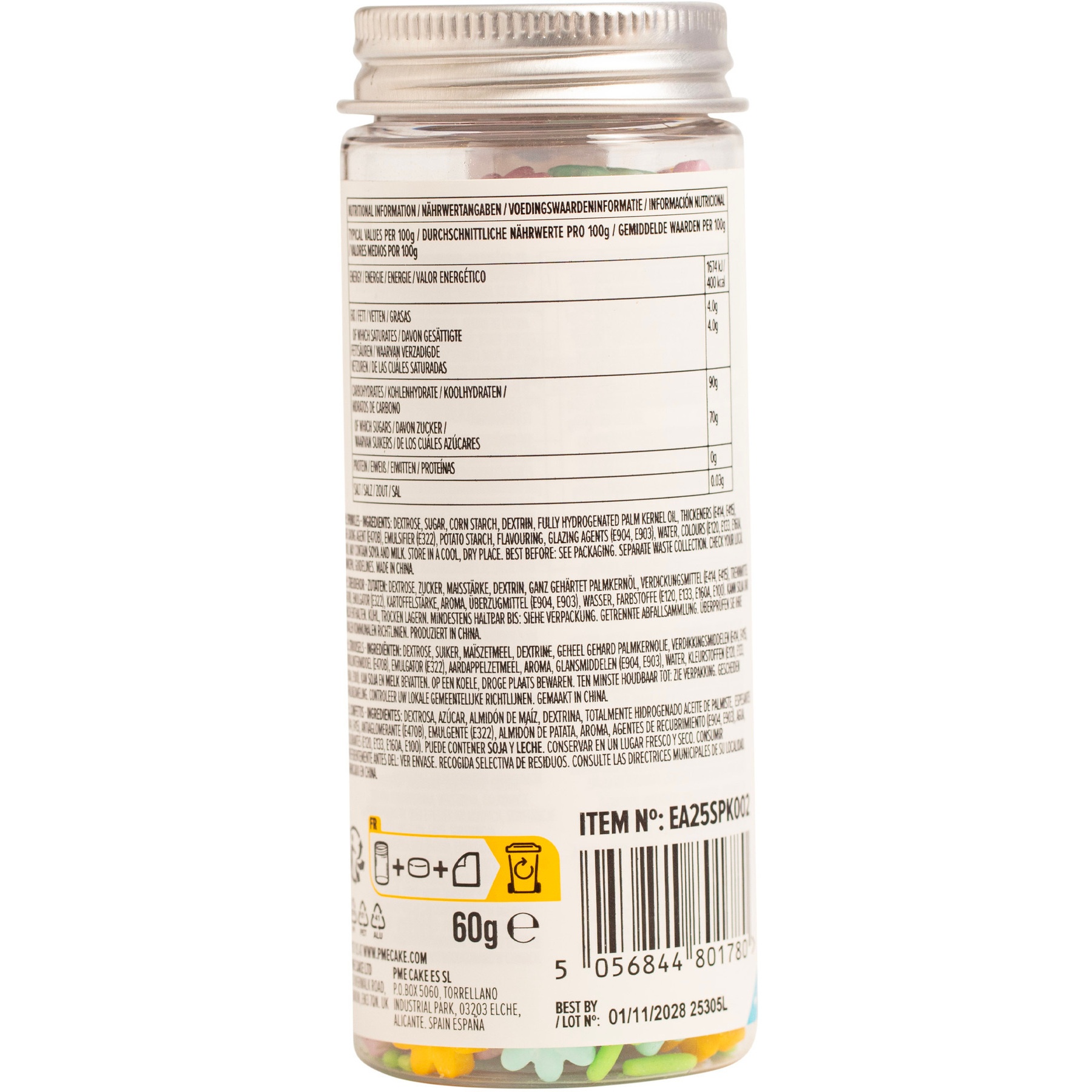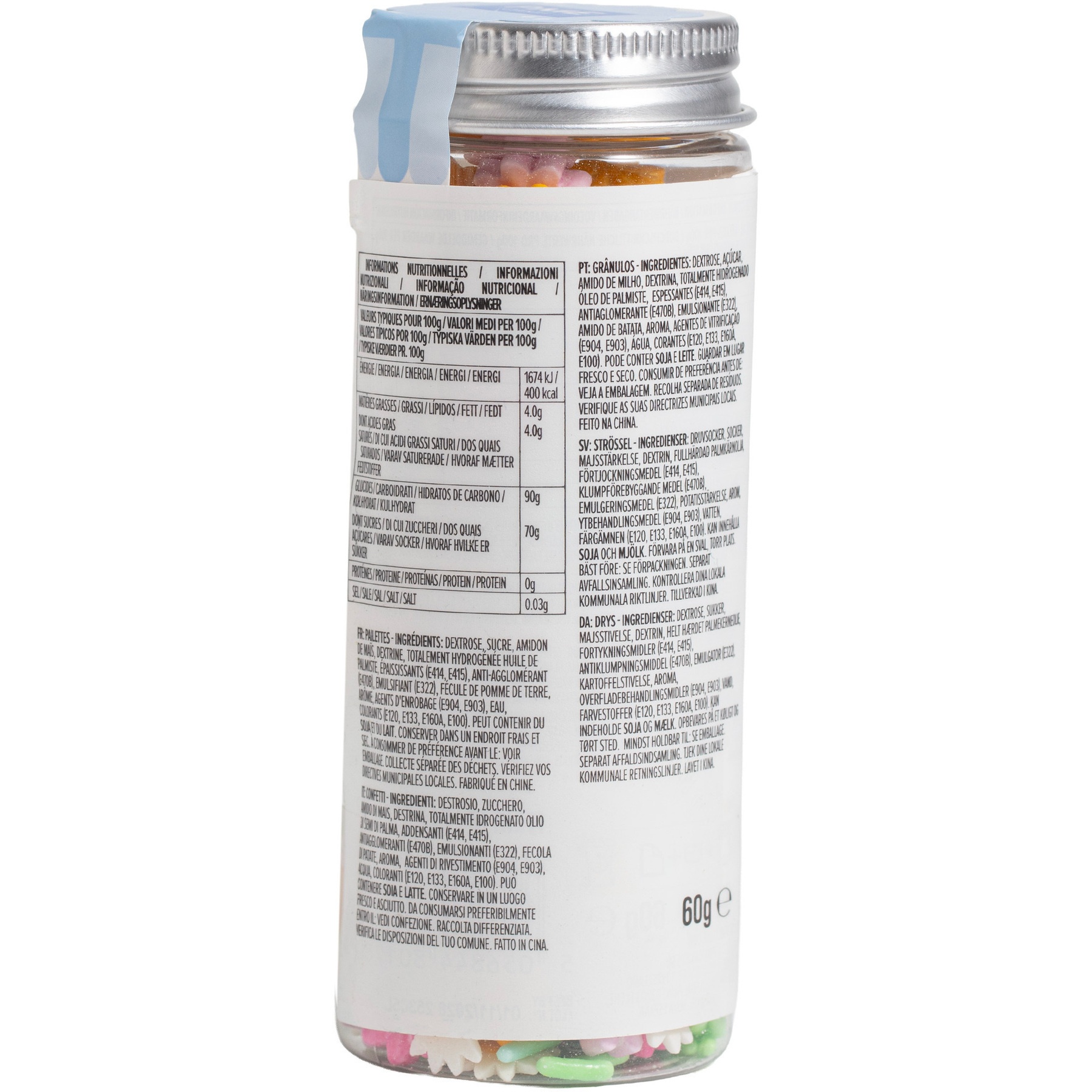 Ingredienti: zucchero, amido di mais, olio di palmisti completamente idrogenato, destrina, emulsionante (E322), amido di patata, addensante (E415), agenti di rivestimento (E904, E903), acqua, coloranti (E160a, E100, E133, E120).