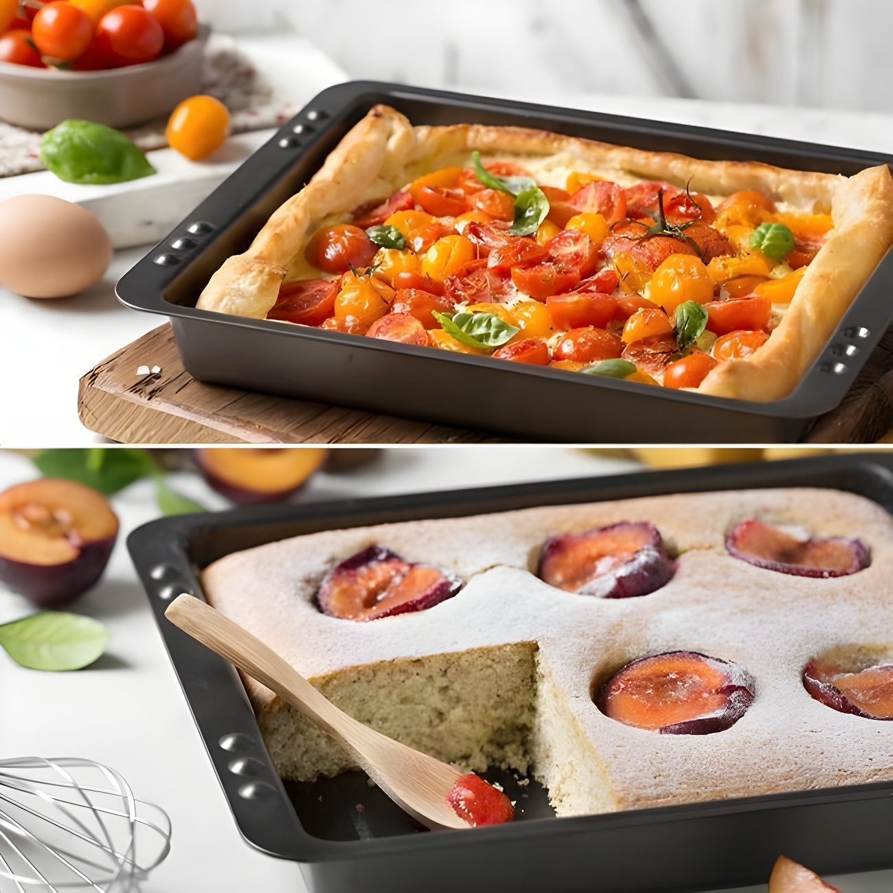 Stampo ideale per ricette dolci o salate. I piccoli fori sulle maniglie dello stampo ti permettono di sovrapporre un'altra stampo uguale usandola come coperchio.