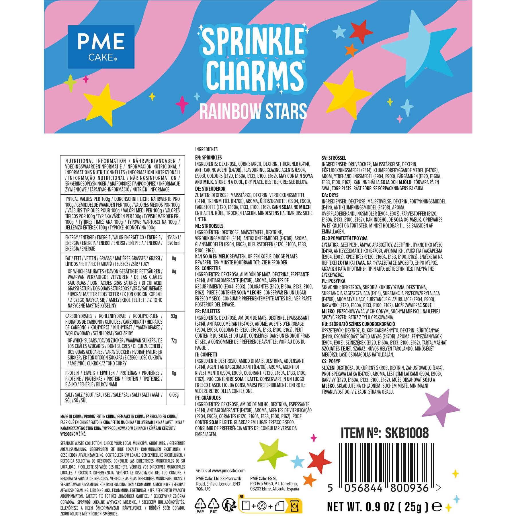 Ingredienti: destrosio, amido di mais, dextrina, addensante (E414), antiagglomerante (E470B), aroma, agenti di rivestimento (E904, E903), colorante (E120, E160A, E133, E100, E162).