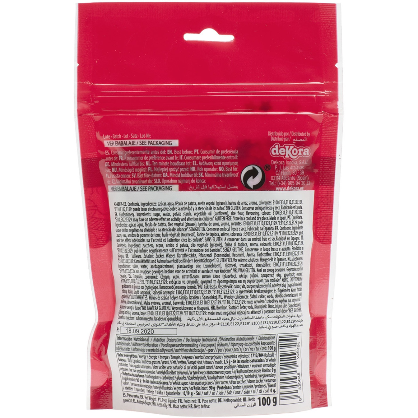 Ingredienti: Olio di girasole alto oleico, Acqua, Amido di patata, Zucchero a velo, Farina di riso, Coloranti: E100, E110, E122, E129, E133, Aroma: Vanillina.
