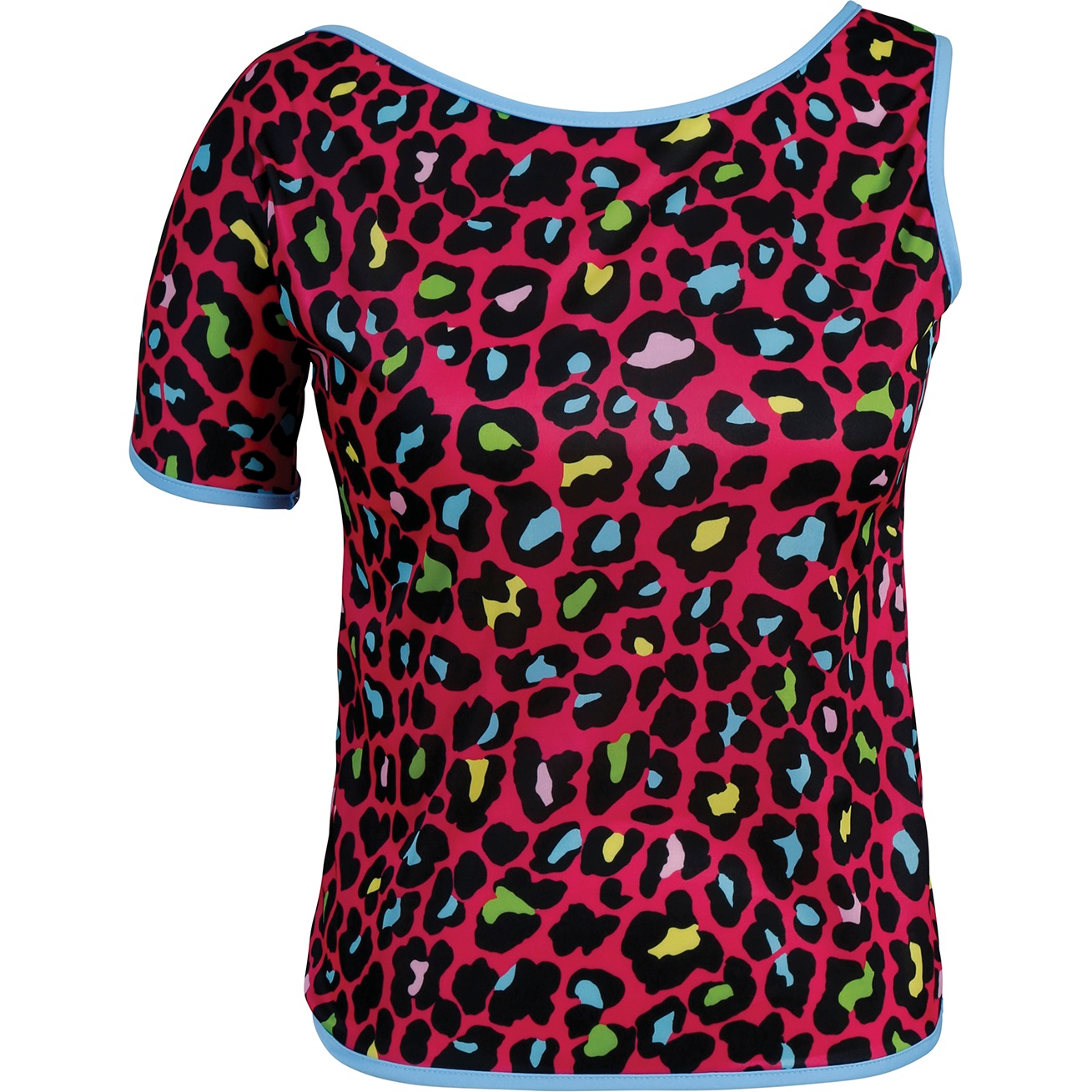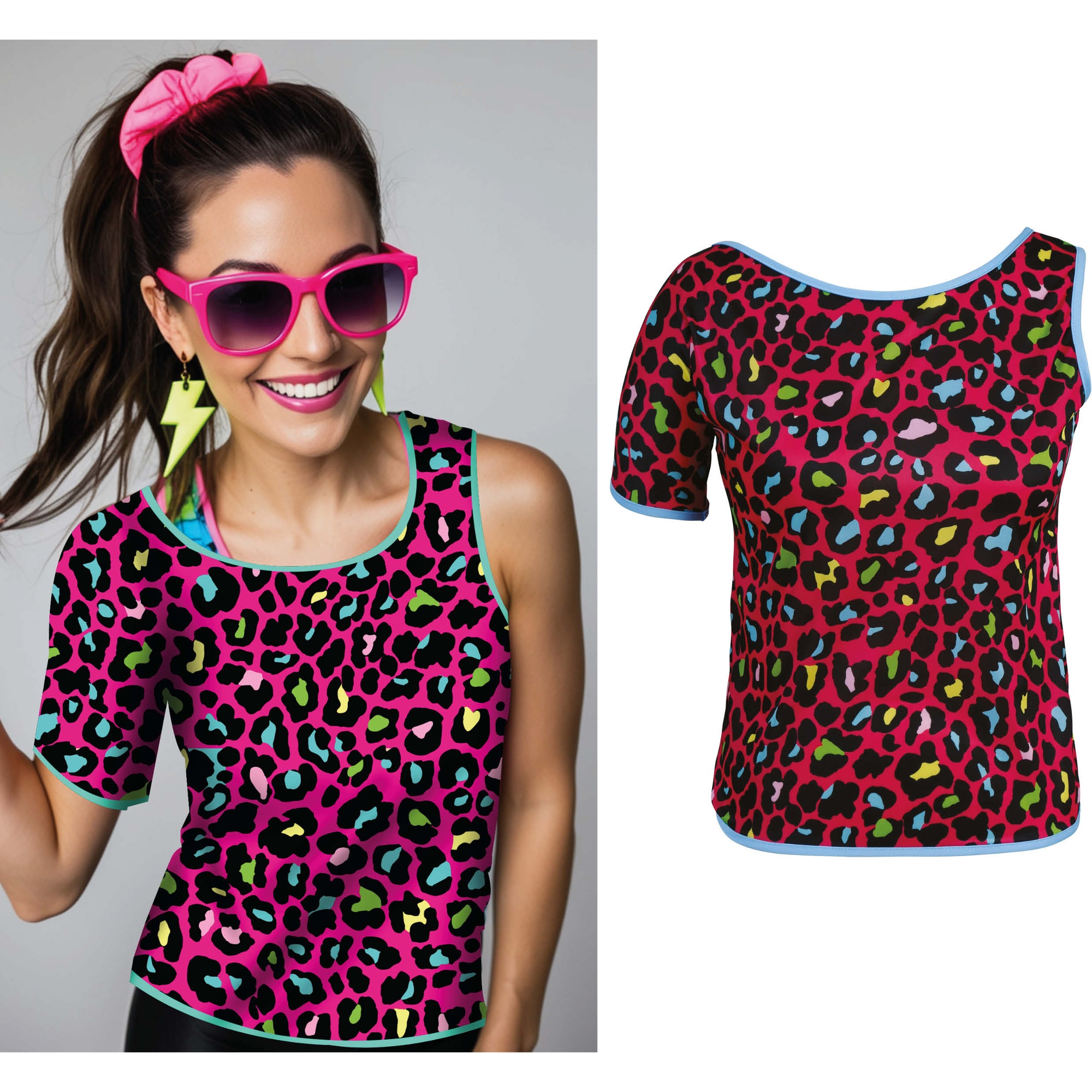 Una T-shirt ispirata agli anni '80 con stampa leopardata in colori neon che cattura tutti gli sguardi. Il taglio comodo a maniche corte è pensato per chi cerca un look divertente e retrò; il tessuto in poliestere garantisce leggerezza e una caduta favorevole. Perfetta da coordinare con accessori fluo per outfit da festa in stile vintage. Dai vita alla tua serata con un tocco anni '80 ricco di colore.