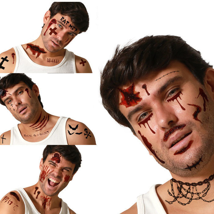 - Set di tatuaggi temporanei che includono tagli sanguinolenti, punti di sutura e graffi. Ideale per costumi da mostro o vittima dell'orrore. Sono disponibili 4 disegni.
