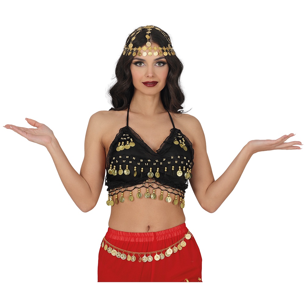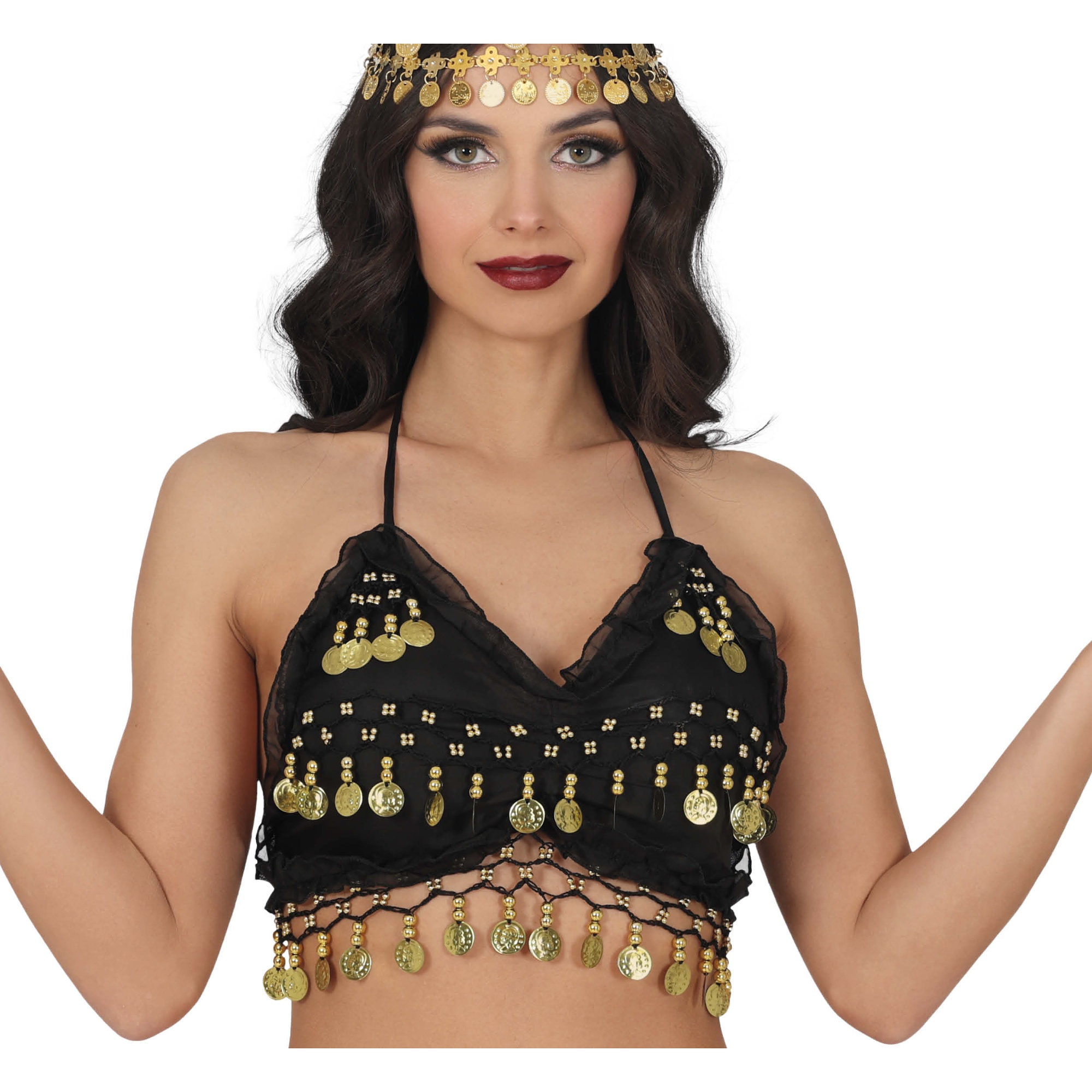 Top nero con monete pensato per la danza del ventre professionale e le esibizioni. Dona luminosità e movimento grazie alle file di monete metalliche che tintinnano a ogni giro, valorizzando la coreografia. Taglio che valorizza la silhouette con scollatura a V e spalline regolabili per una vestibilità comoda e sicura. Perfetto per spettacoli, lezioni, feste a tema e Carnevale; si abbina con facilità a gonne, cinture o accessori in stile orientale per completare il look.