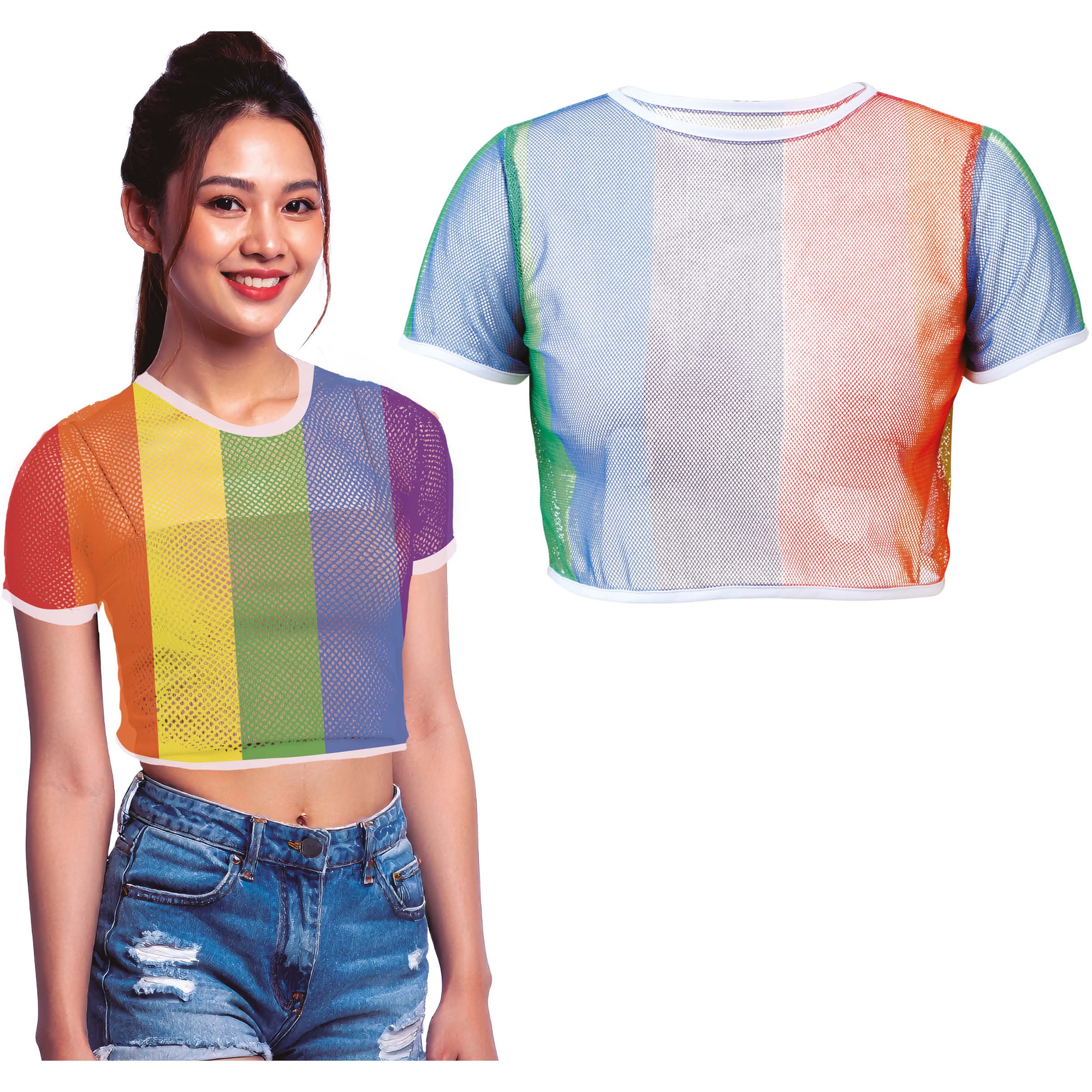 Top crop in rete dai vivaci toni arcobaleno con effetto semitrasparente. Realizzato in leggero tessuto di poliestere, è traspirante e dona movimento e colore. Il taglio corto con bordi bianchi su collo e maniche conferisce una finitura moderna e curata. Ideale da sovrapporre ad altri capi per creare outfit versatili e d'impatto. Indumento pensato per adulti che desiderano un tocco di colore comodo e di tendenza.