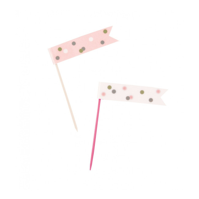 Confezione composta da 6 stecchini di legno decorati a forma di bandiera con pois. Ogni metà ha i colori invertiti rispetto all'altra metà.