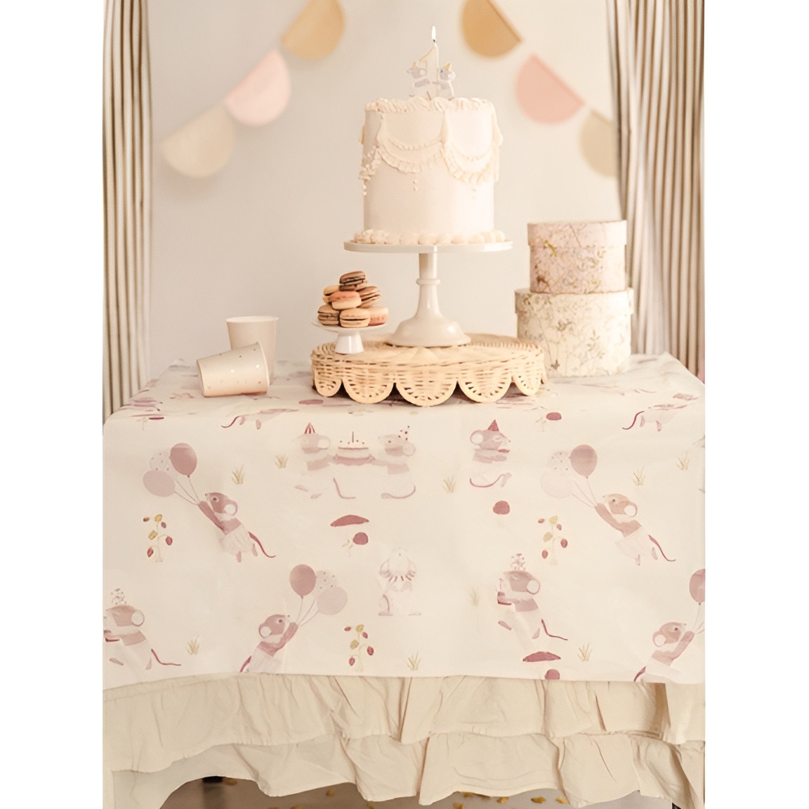 Tovaglia di carta "Mice" in tonalità beige con un delicato motivo di topolini. Misure aperte: 180 x 120 cm; pensata per donare un tocco tenero e coordinato alle tavole dei bambini. Progettata per facilitare la decorazione e la sistemazione dopo la festa, ha un aspetto neutro che si abbina a diversi stili e palette di colore. La finitura opaca esalta il disegno e mantiene un'estetica curata sulla tavola.