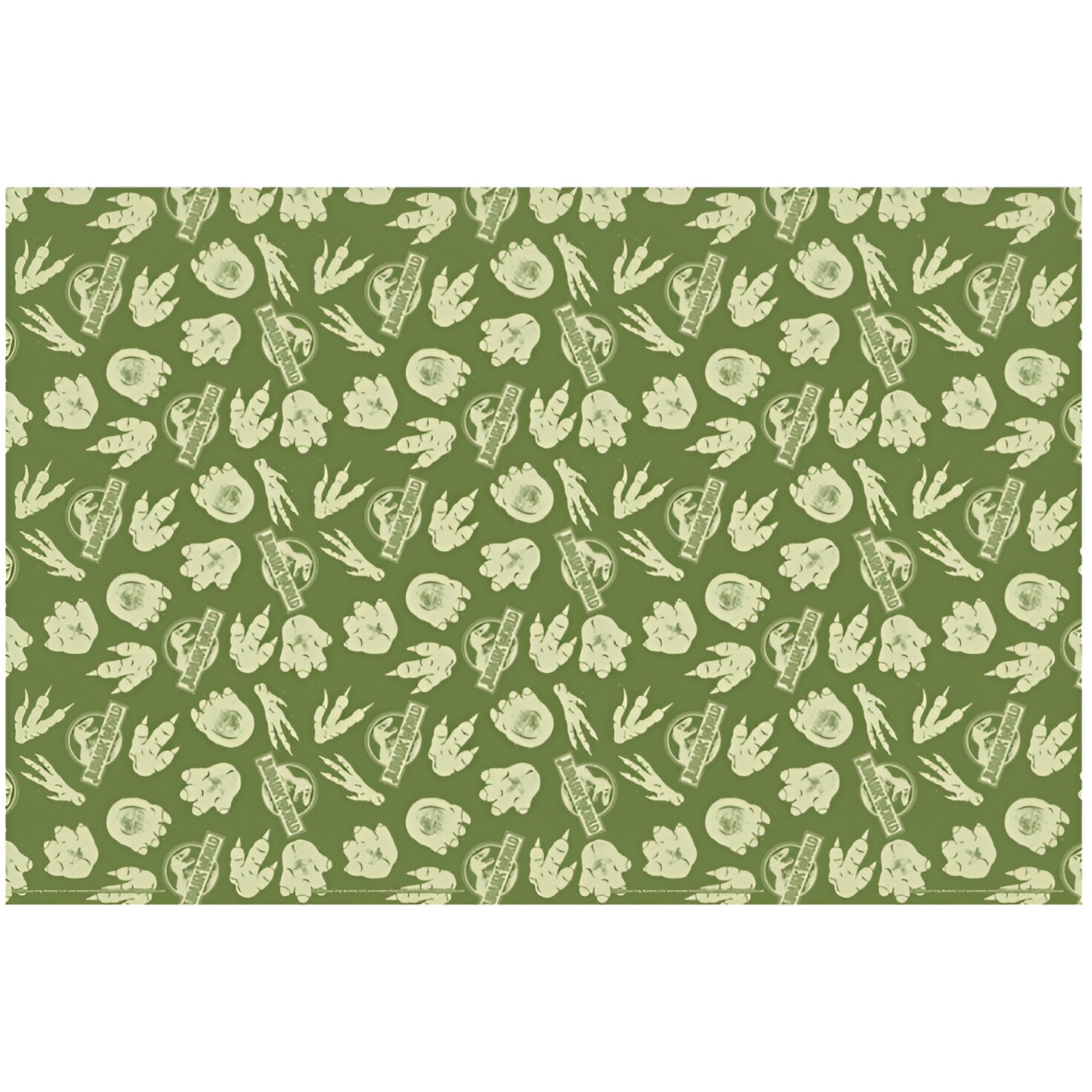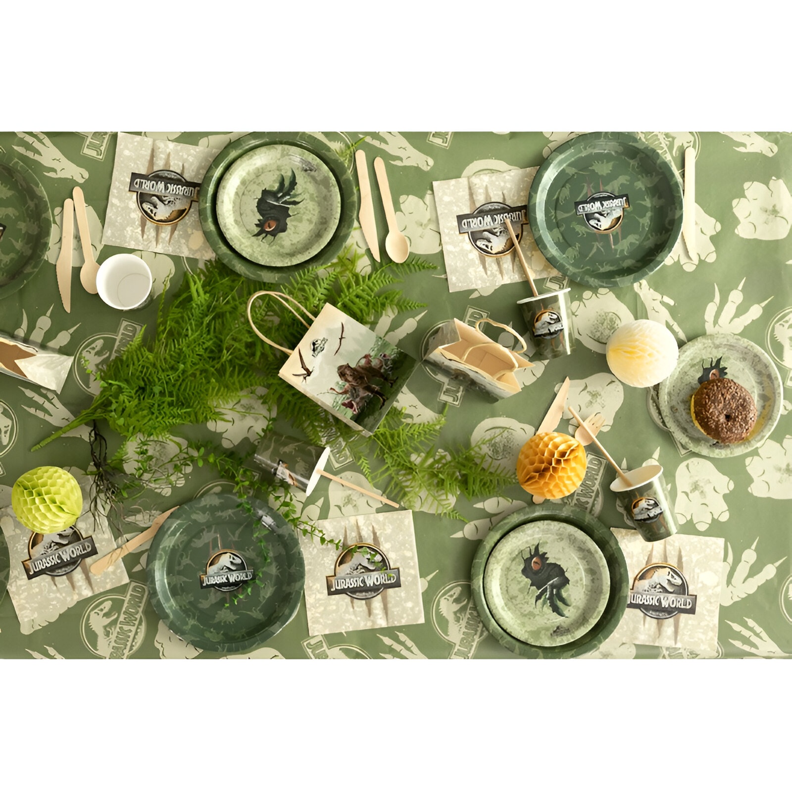 Tovaglia monouso Jurassic World in tonalità verdi con motivo di impronte, teschi e logo ufficiale. Dona un'ambientazione vivace e a tema per le feste dei più piccoli. La dimensione aperta è di 180 x 120 cm, ideale per tavoli rettangolari. Prodotto usa e getta pensato per semplificare la decorazione delle feste a tema Jurassic World.