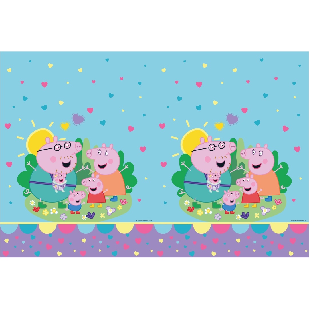 Tovaglia in plastica decorativa con il vivace design di Peppa Pig e motivi a cuori, ideale per allestire feste per bambini.