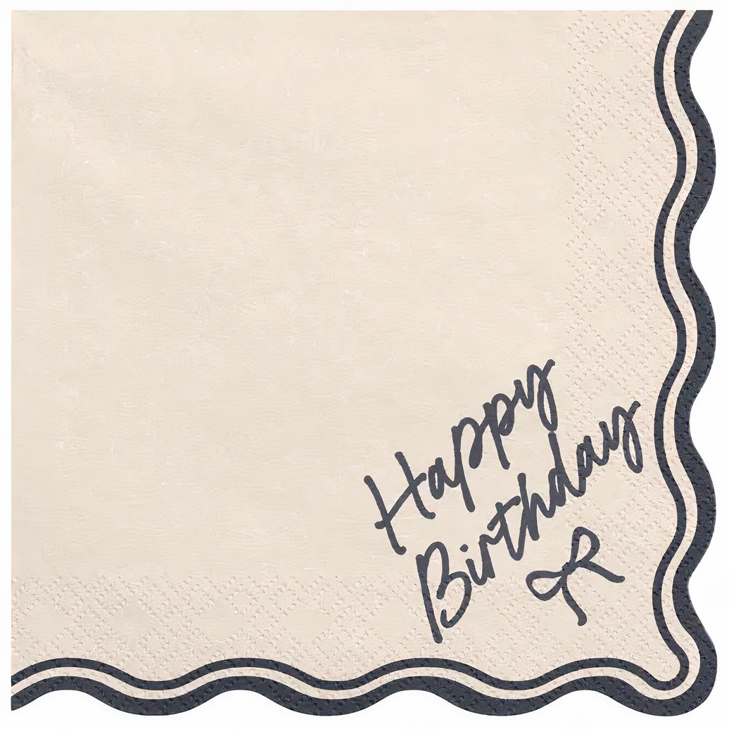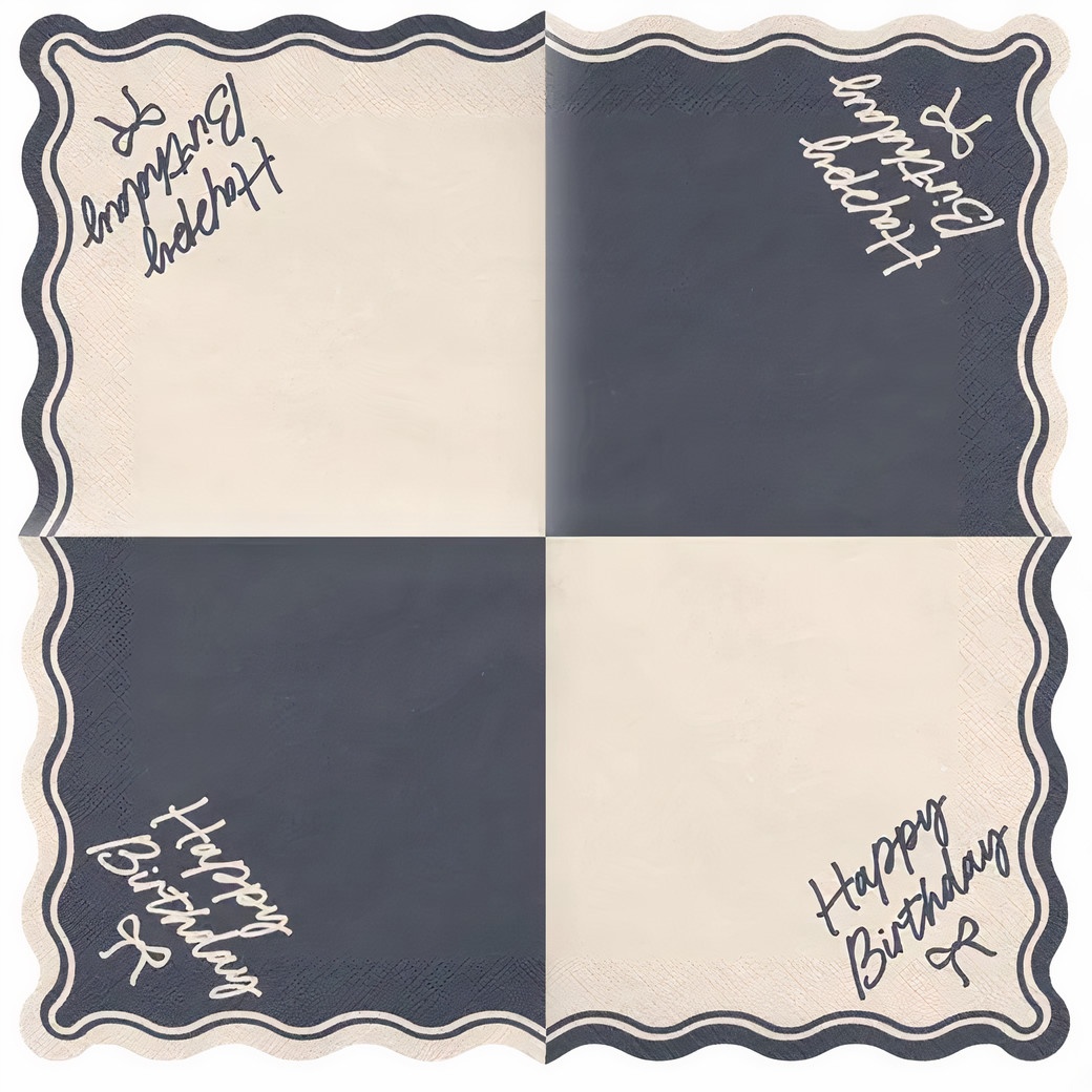 Tovaglioli di carta a 2 veli con un elegante motivo "Happy Birthday Bow" nei toni del beige e del nero. Il decoro abbina una grafia a mano a un bordo ondulato che conferisce un tocco raffinato alla tavola. Dimensioni: aperti 33 x 33 cm; chiusi 16,5 x 16,5 cm. Confezionati in pratici pacchetti, perfetti per feste di compleanno e incontri dallo stile ricercato.