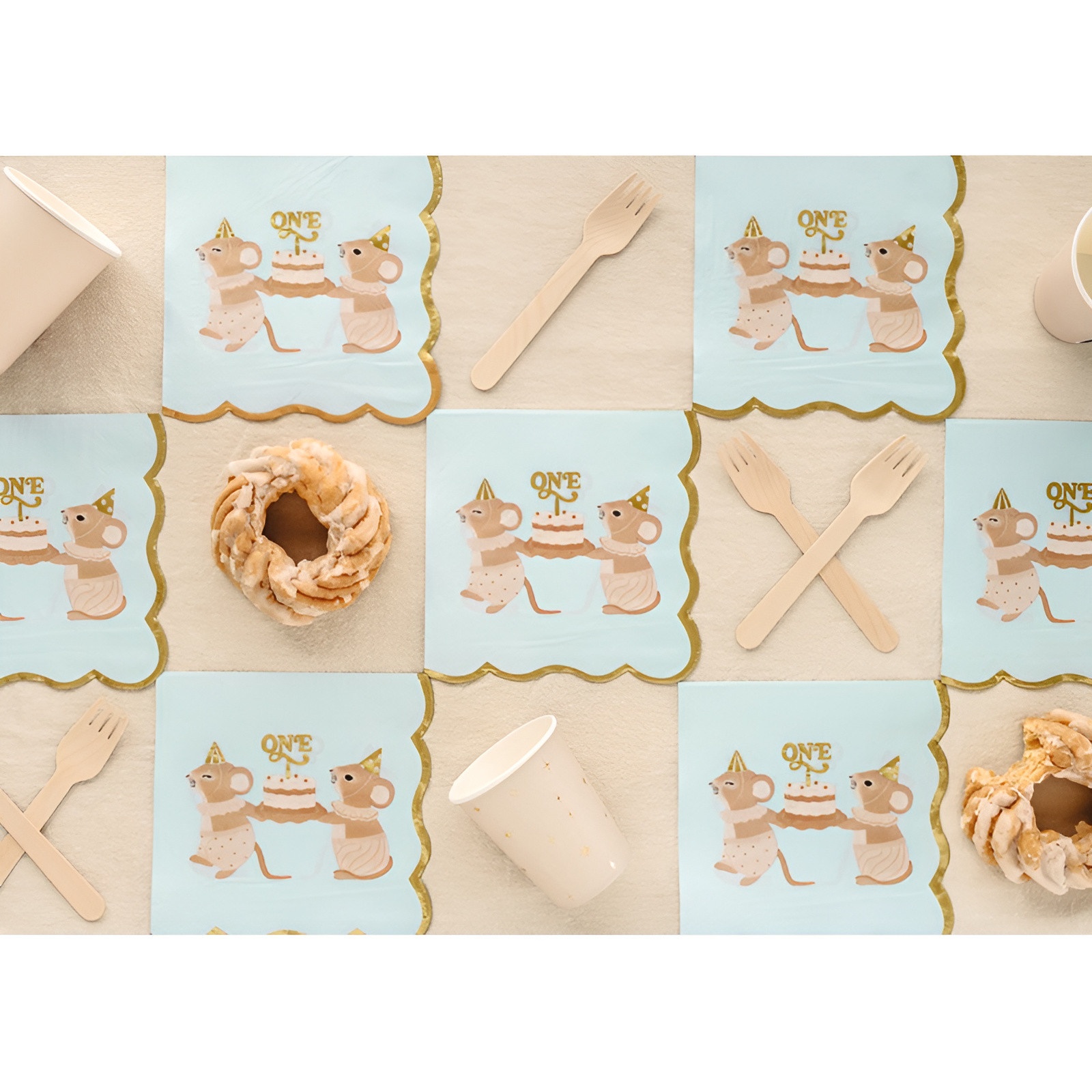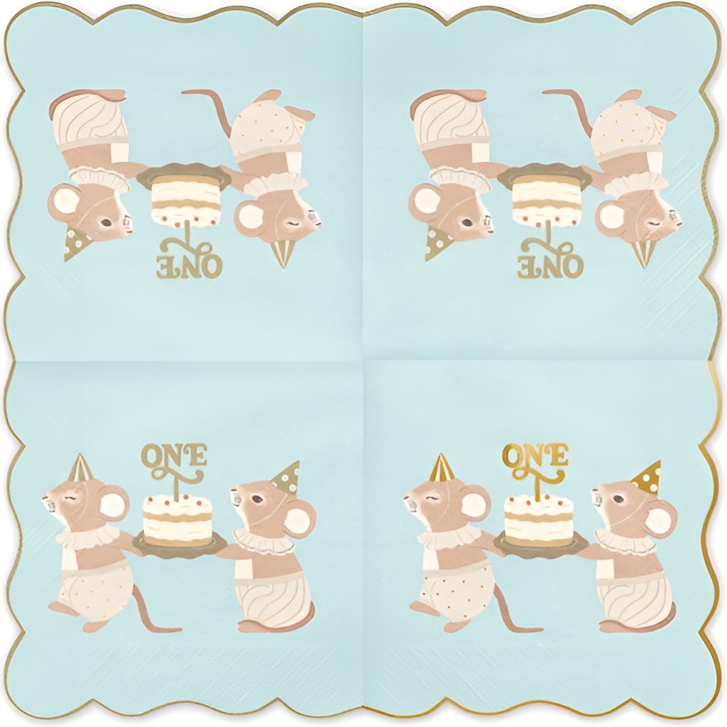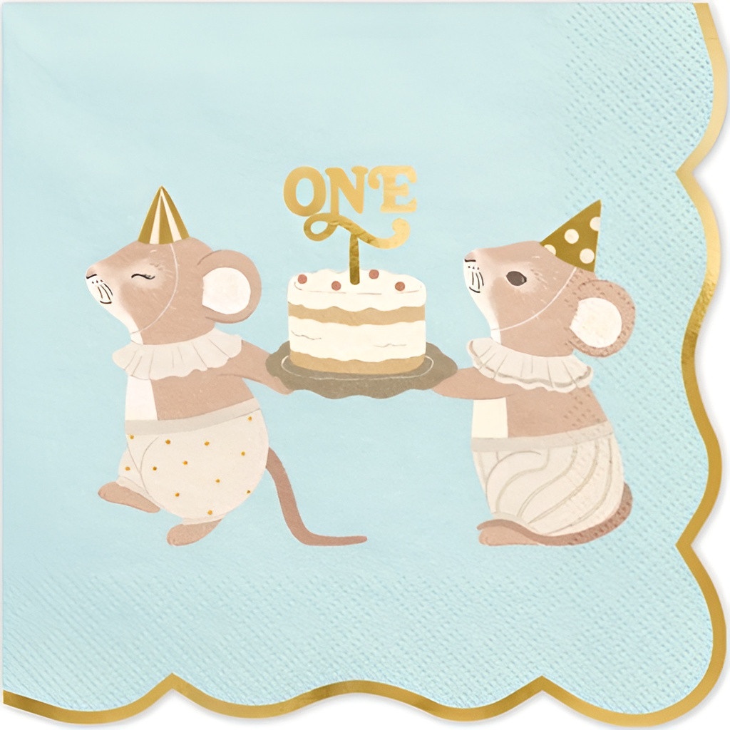 Tovaglioli in carta a due veli con un tenero design di topolini e la scritta "ONE" su sfondo azzurro. Misure: 33x33 cm aperti e 16,5x16,5 cm piegati. Design dolce ed elegante pensato per festeggiare il primo compleanno con stile. Confezione pratica e compatta, perfetta per decorare la tavola e coordinarsi con la restante carta per feste.