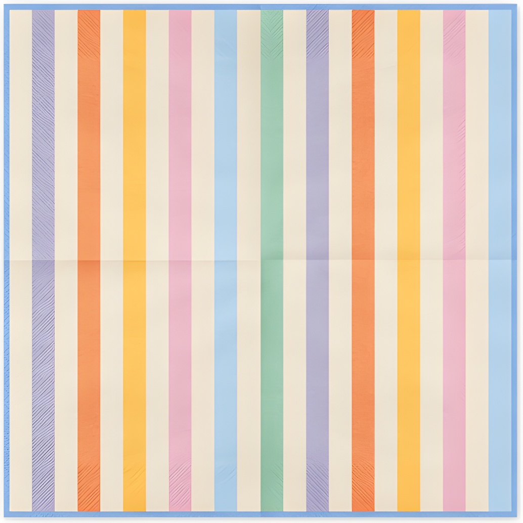 Tovaglioli di carta con una simpatica stampa a righe in tonalità pastello e colori vivaci, pensati per completare le decorazioni per bambini con stile. A due strati per un tocco morbido e maggiore assorbenza. Misure: aperti 33 x 33 cm; piegati 16,5 x 16,5 cm. Confezione pratica, perfetta per allestire tavole a tema.