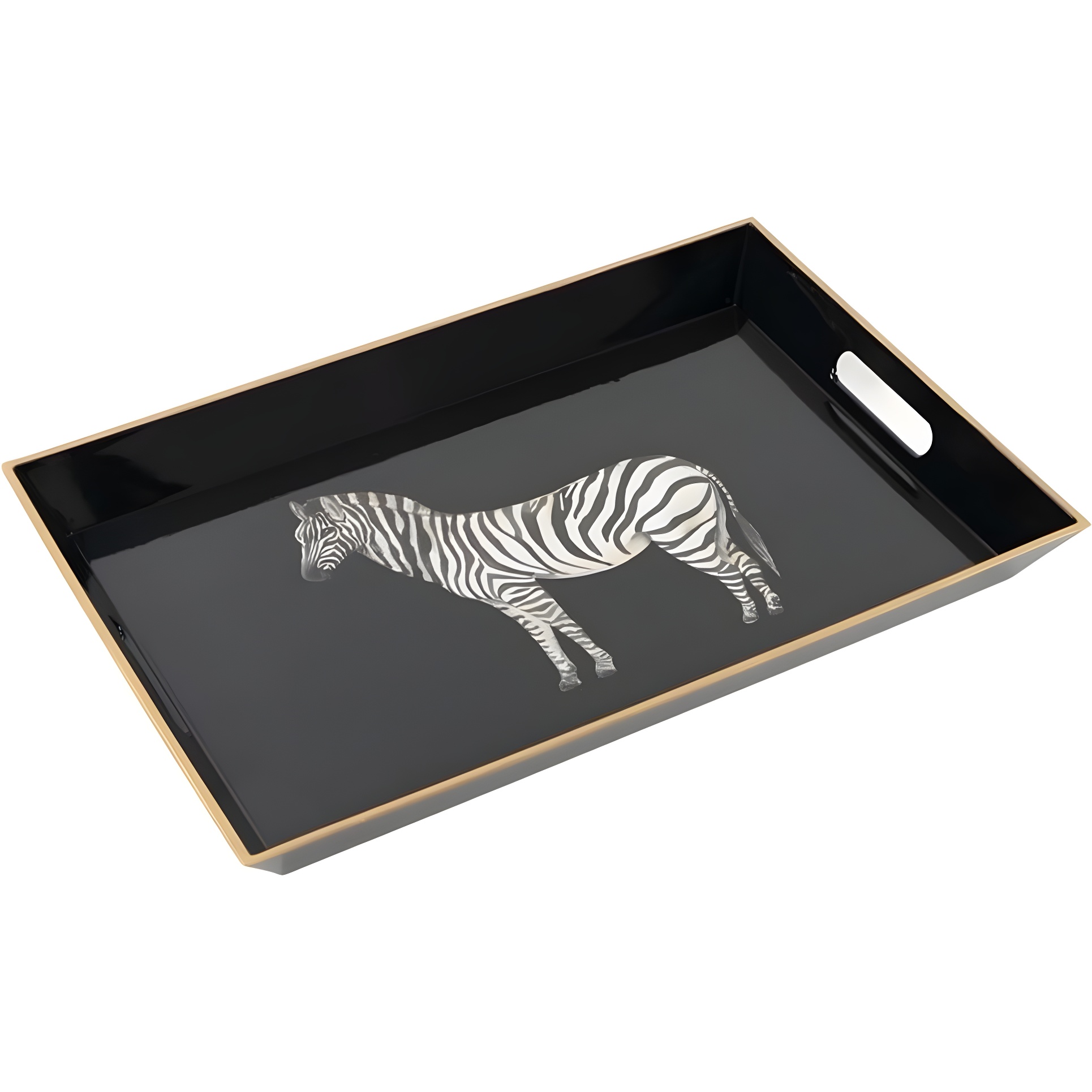 Elegante vassoio decorativo nero con illustrazione di zebra e bordo dorato, perfetto per aggiungere un tocco sofisticato alla casa.