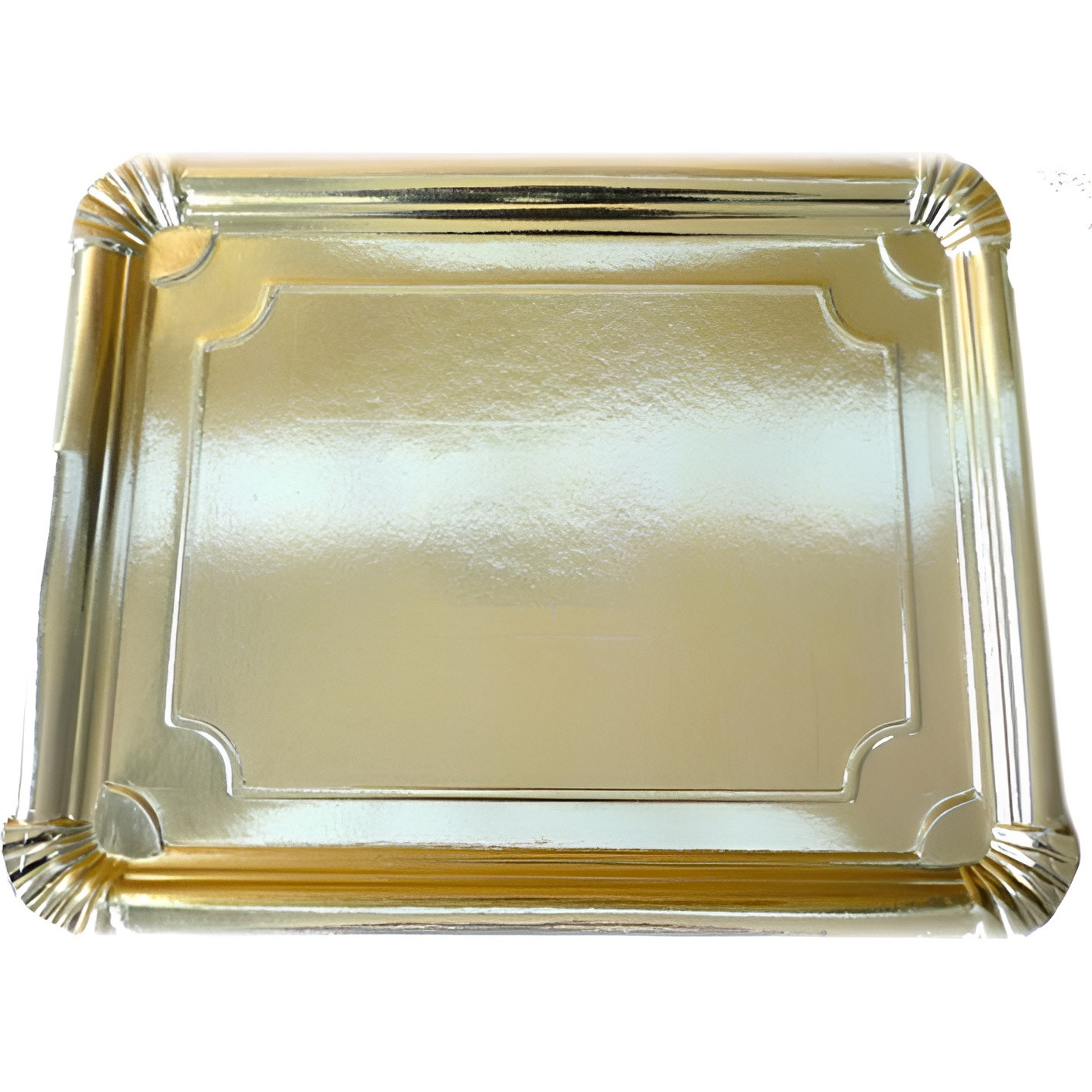 Bandejas Oro Aplisa Nº11. Vassoi monouso con finitura dorata lucida che aggiungono un tocco elegante e professionale a ogni presentazione. Misure 28 x 36 cm, formato rettangolare ideale per dolci, antipasti e allestimenti vari. Bordo studiato per garantire maggiore stabilità e una manipolazione sicura. Confezione da 50 unità, pensata per eventi, catering e celebrazioni.
