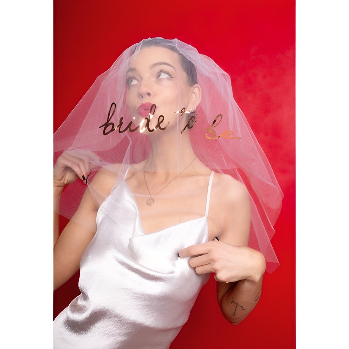 Velo bianco con la scritta Bride to be in rosa-dorato. Lunghezza di circa 63 cm per un look elegante e leggero; il doppio strato aggiunge volume e movimento senza appesantire. Include pettine integrato per una fissazione comoda e sicura.