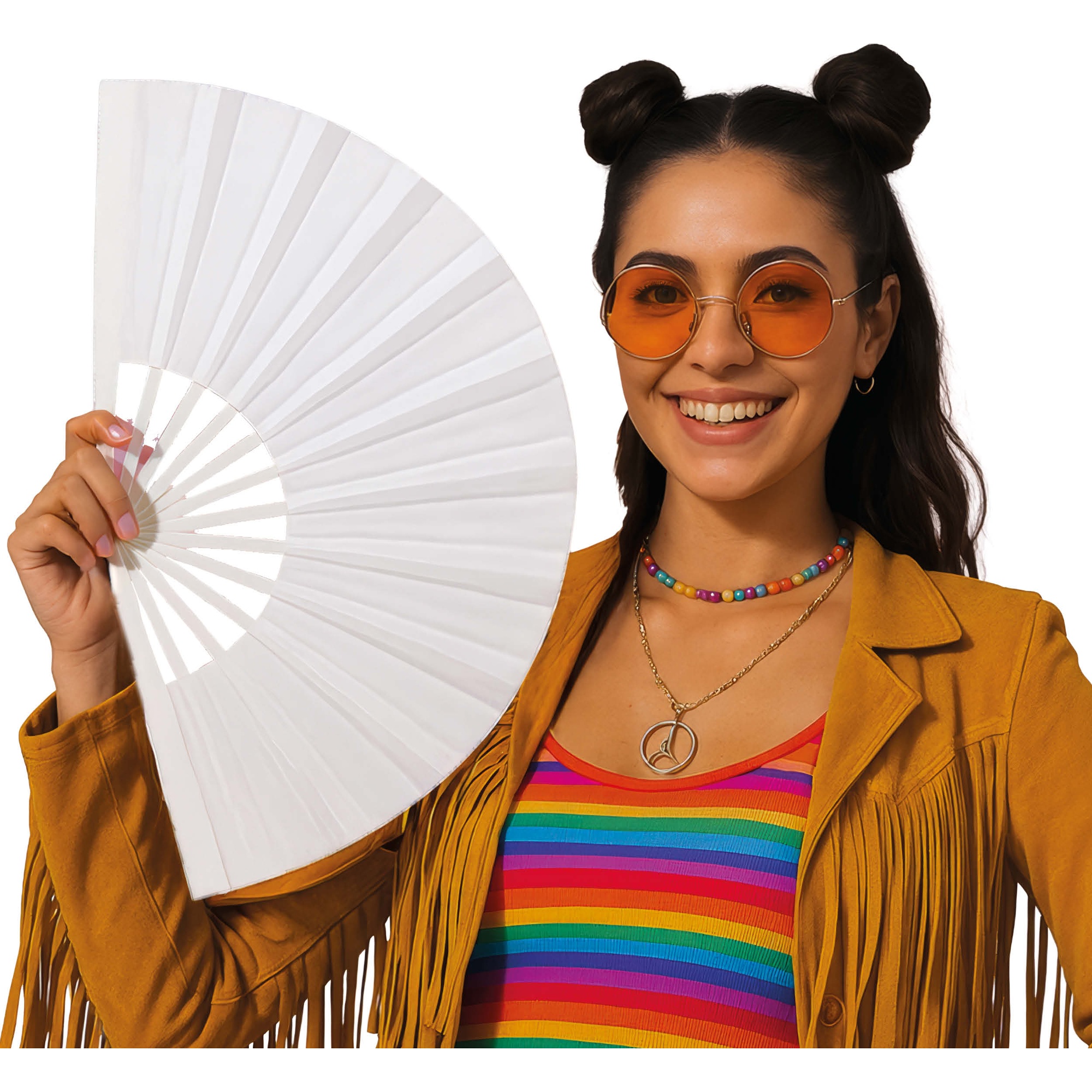 Ventaglio pieghevole in tessuto 60 x 30 cm. Leggero e maneggevole, aggiunge un tocco elegante e festoso a qualsiasi look o ambientazione. Il formato pieghevole ne facilita il trasporto e la conservazione. Perfetto per completare costumi, animare feste e risaltare in servizi fotografici e spettacoli.