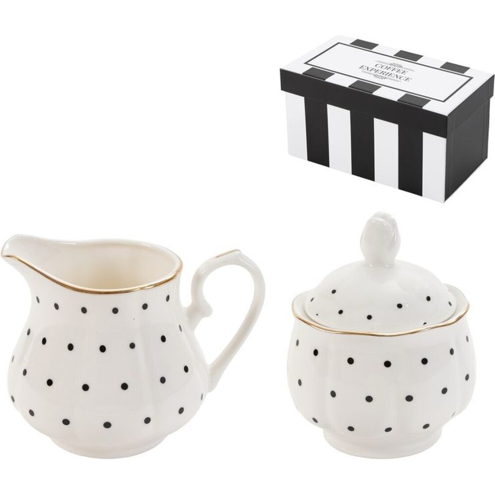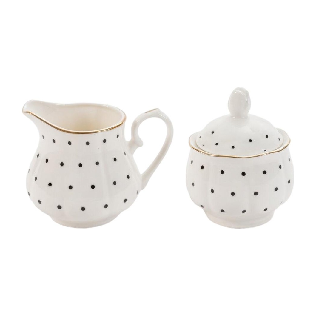 Un set sofisticato che porta un tocco raffinato a qualsiasi tavola. Il bianco decorato con pois neri e il sottile bordo dorato creano un contrasto classico ed elegante.
